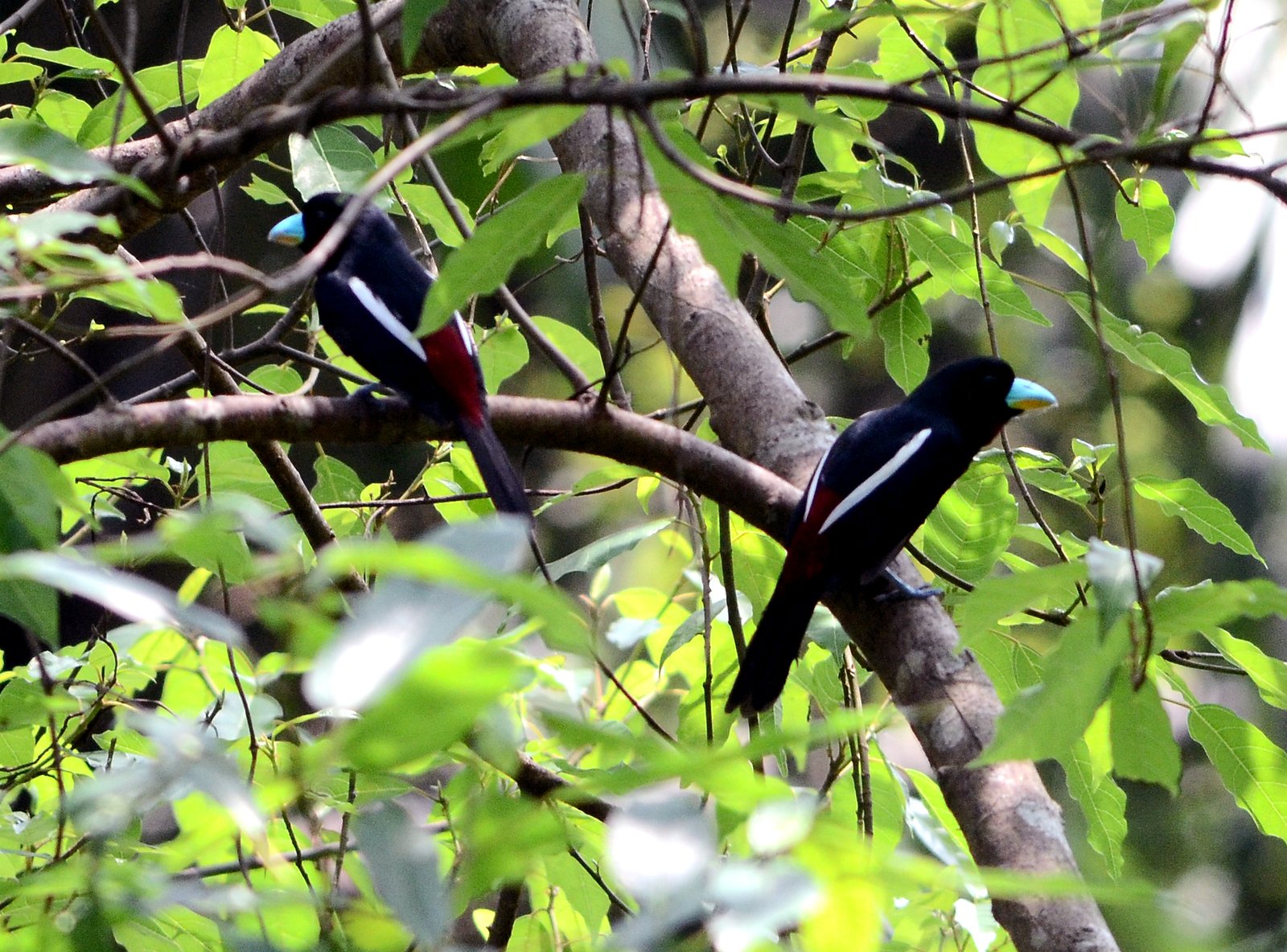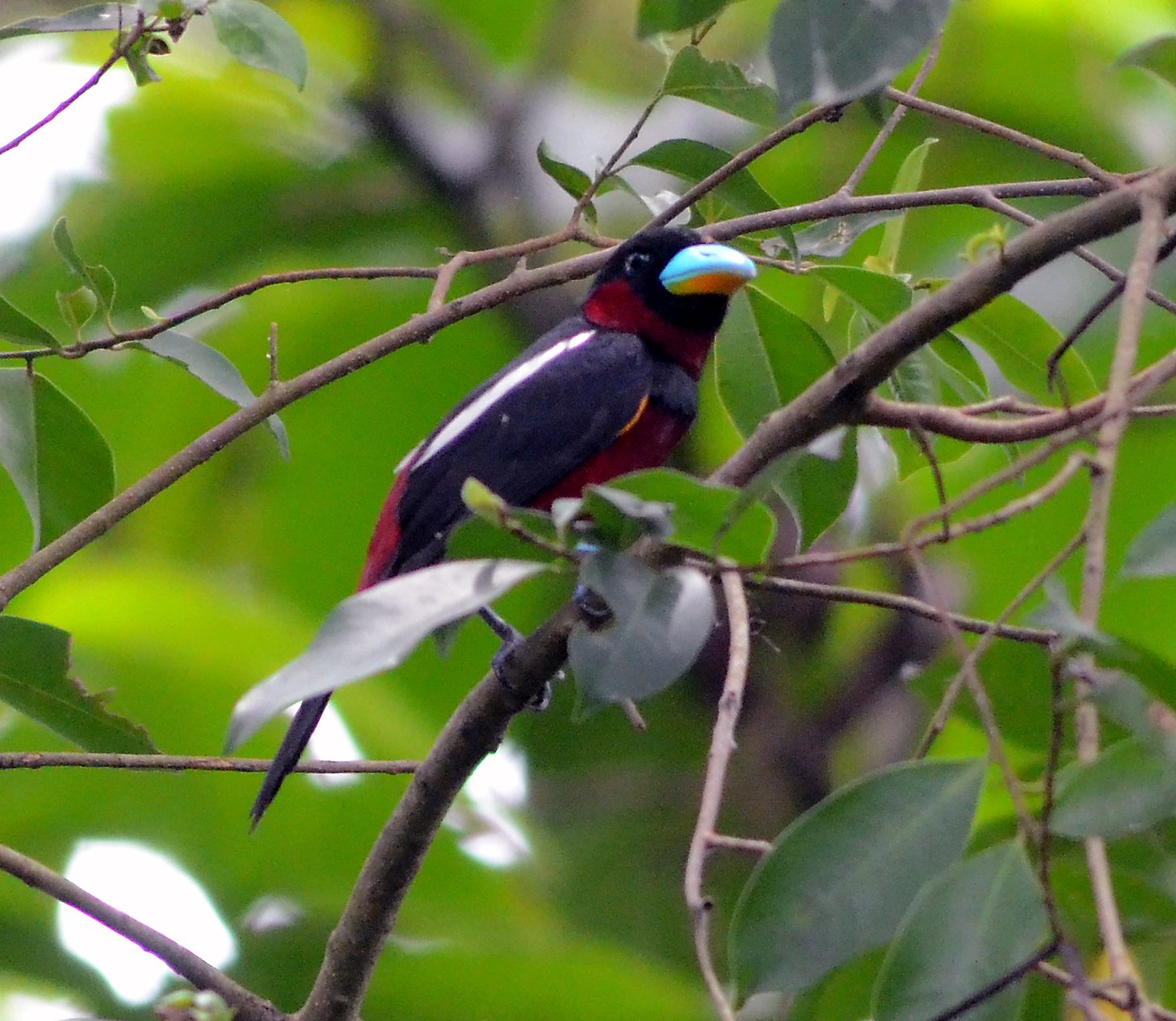 The Black-and-red Broadbill ranges across Southeast Asia, inhabiting tropical lowland and mangrove and other wetlands and swamp forests, particularly near water or along rivers in countries like West Malaysia and Borneo, often showing tolerance for disturbed riverine habitats, and even fairly degraded areas, with not many tall or mature trees.