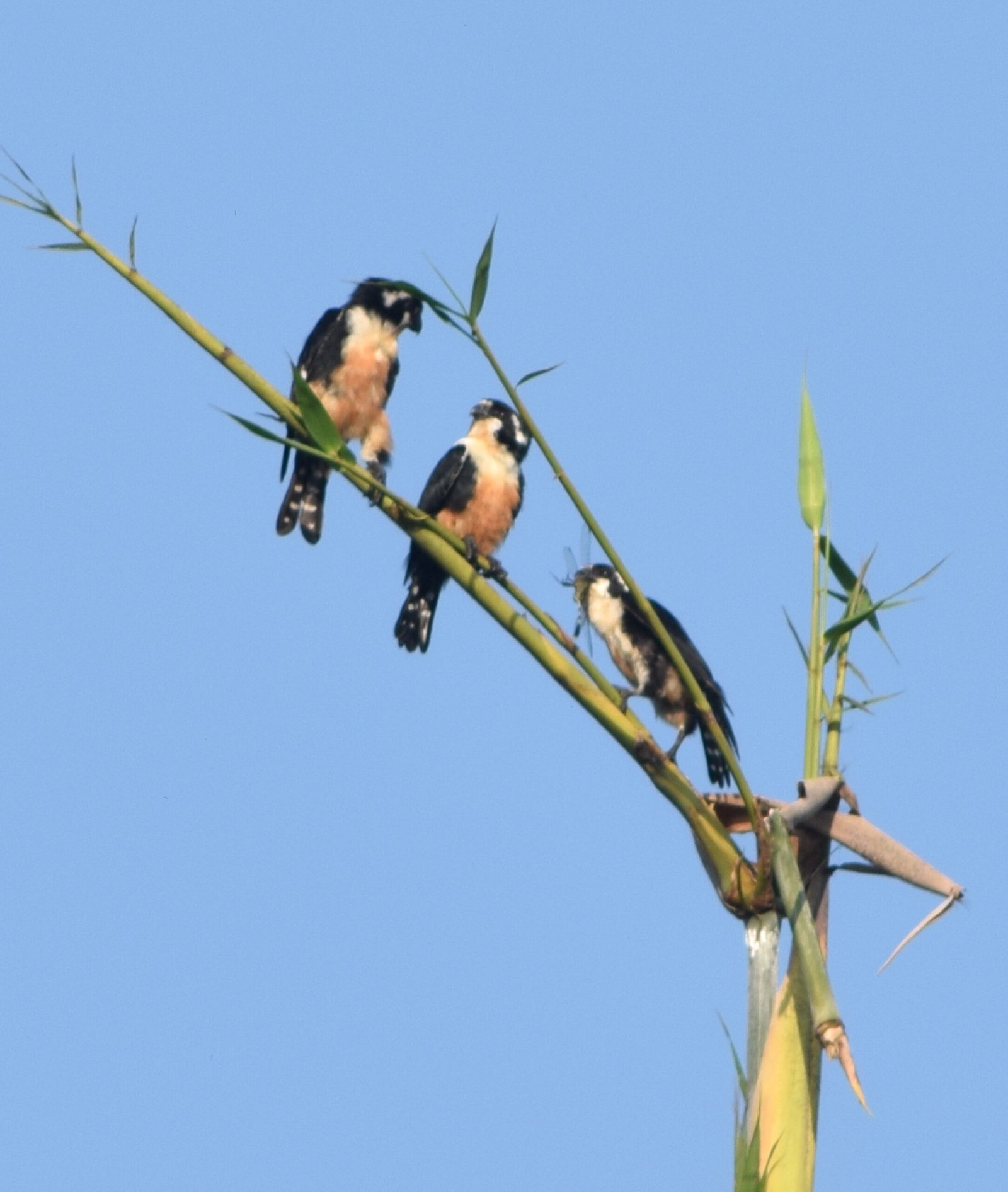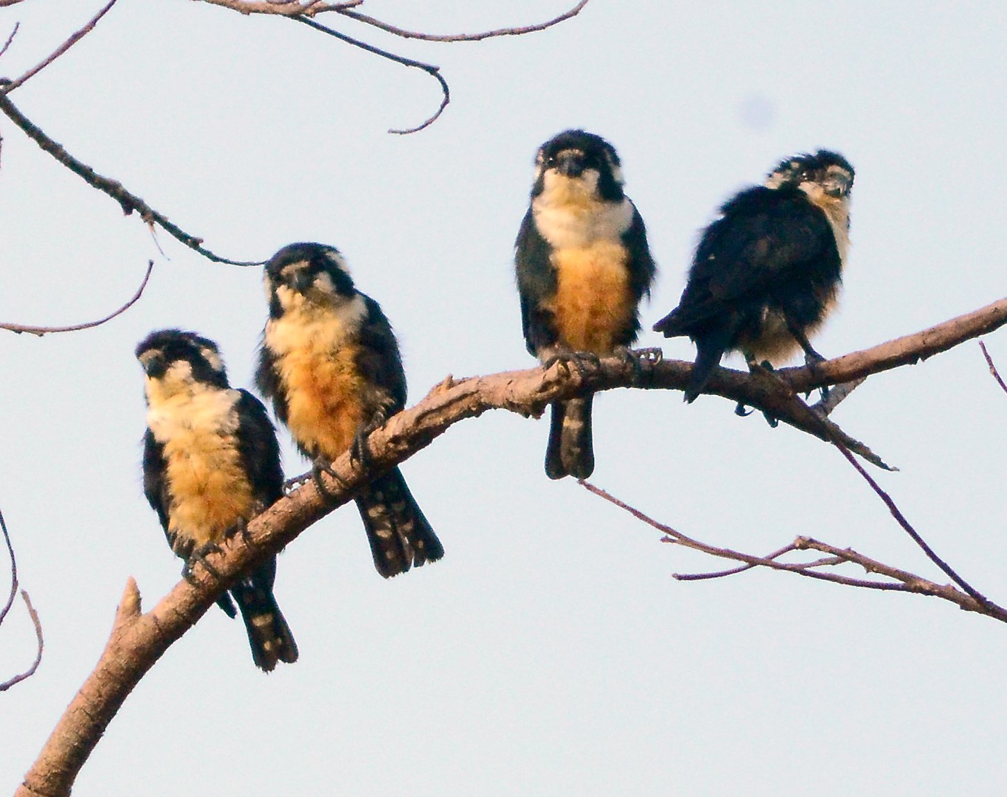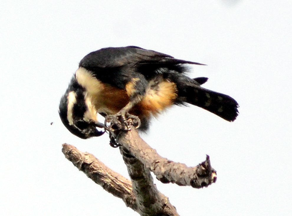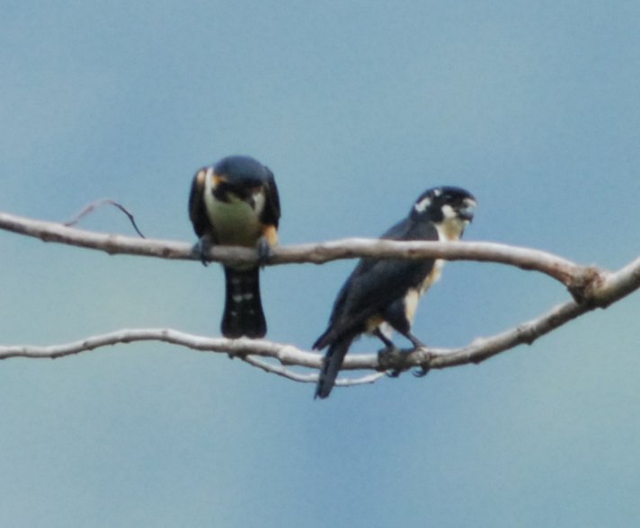 Although often mentioned as socialble raptors, more likely they are part of a closed family group. The Black-thighed Falconet’s breeding involves using old barbet/woodpecker holes laying 2-5 eggs, which fledge in about 3-4 weeks after a 3-4 week incubation.