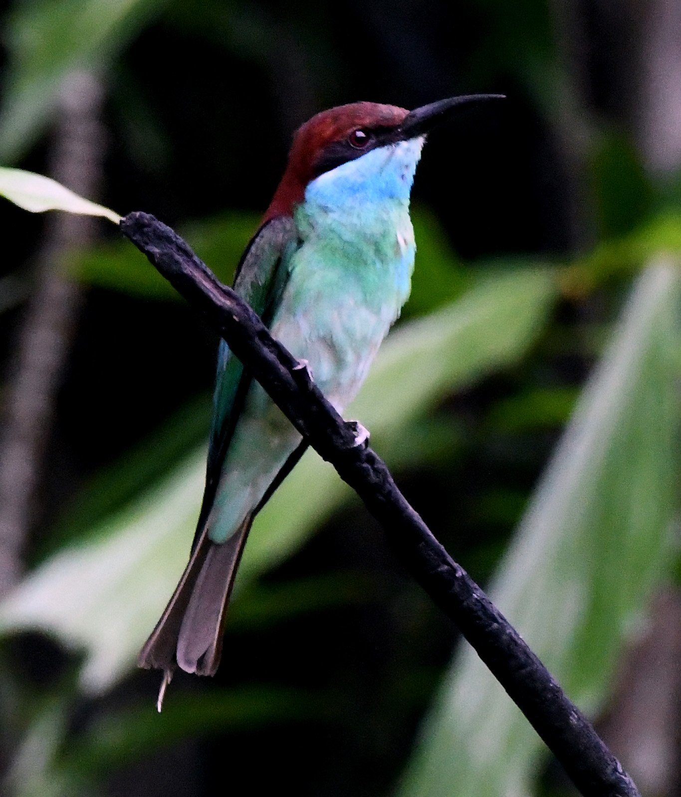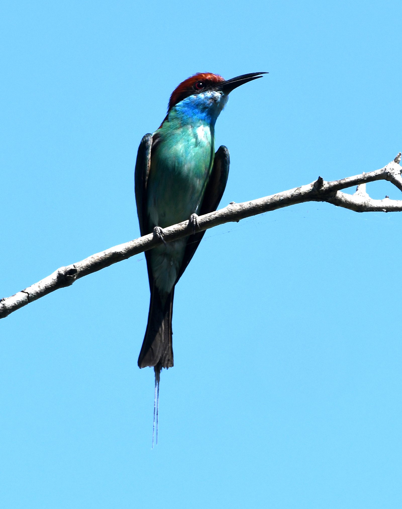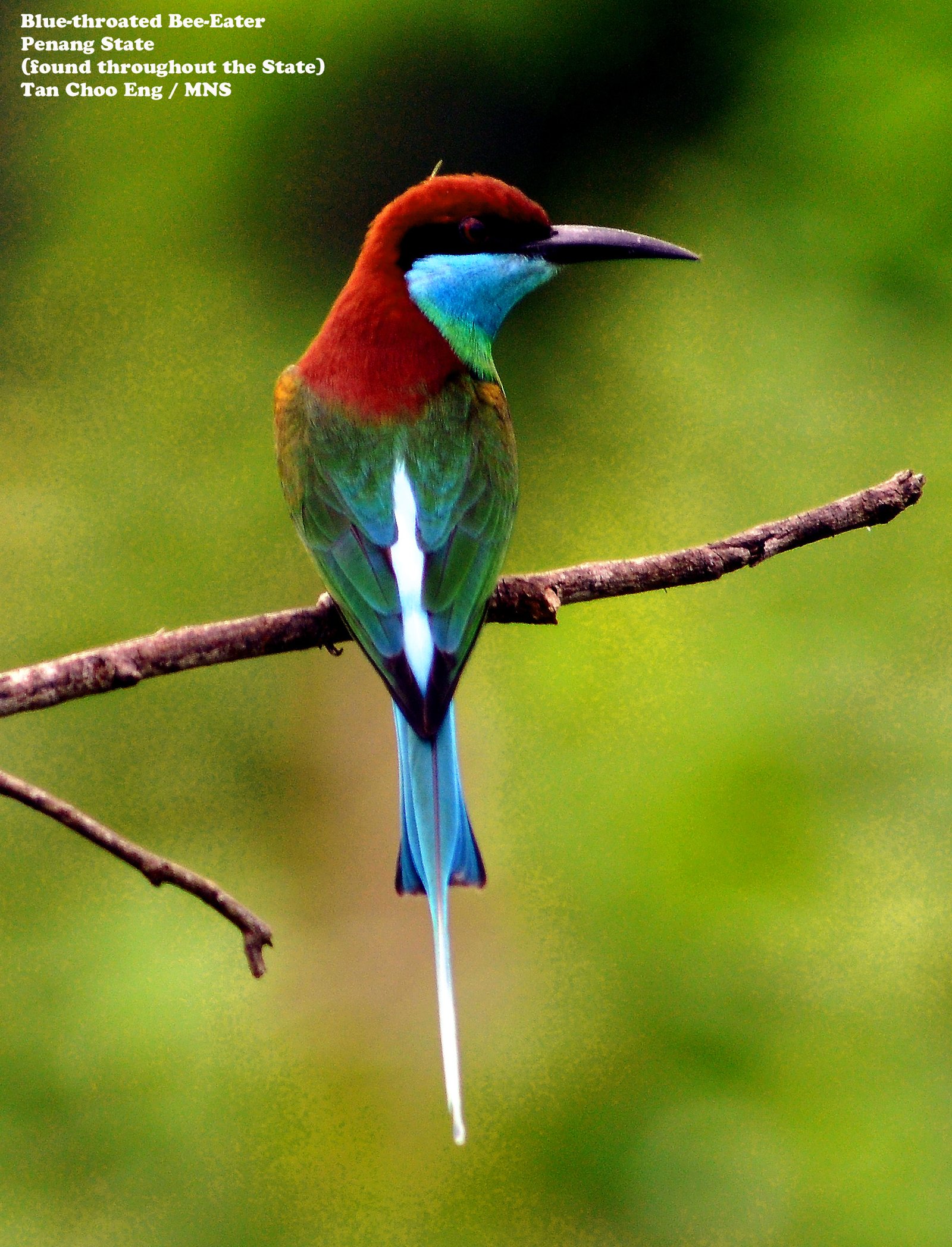 The Blue-throated Bee-eaters in Southeast Asia are known for their stunning bright blue throats, green bodies, chestnut crowns, and acrobatic aerial insect-catching skills (bees, dragonflies).
