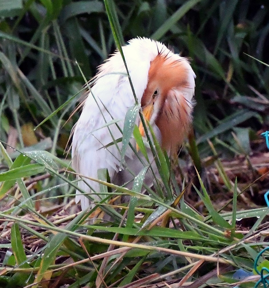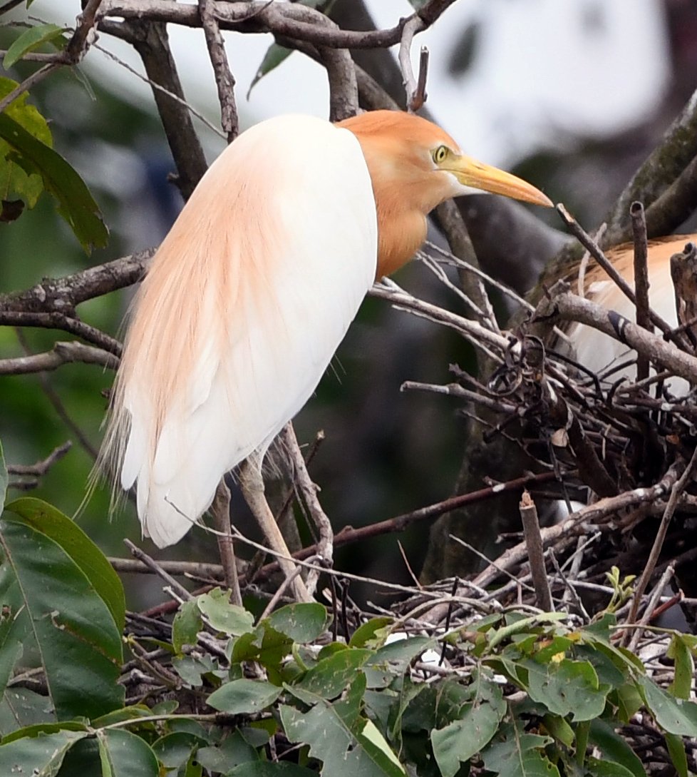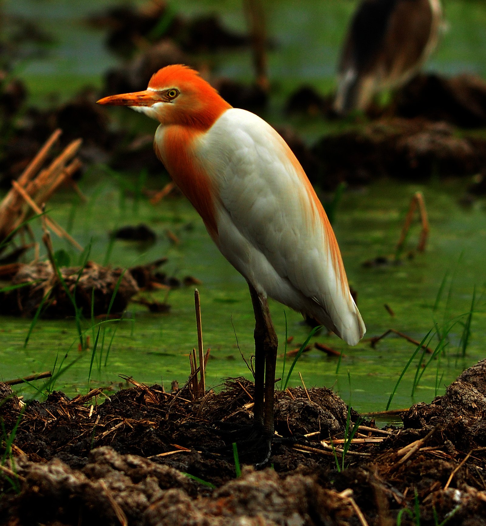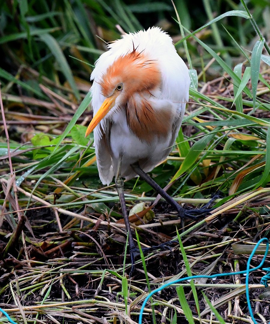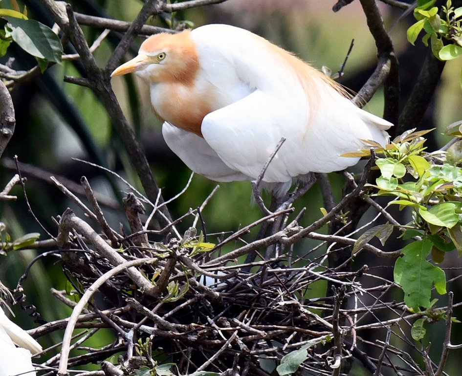 The Cattle Egret is a common, gregarious and widespread egret known for its short neck, yellow bill, and tendency to follow large animals or machinery for insects in grasslands, paddy fields and wetlands. In breeding season, they develop striking orange-buff plumes on the head, neck, and back, with reddish legs and bill.