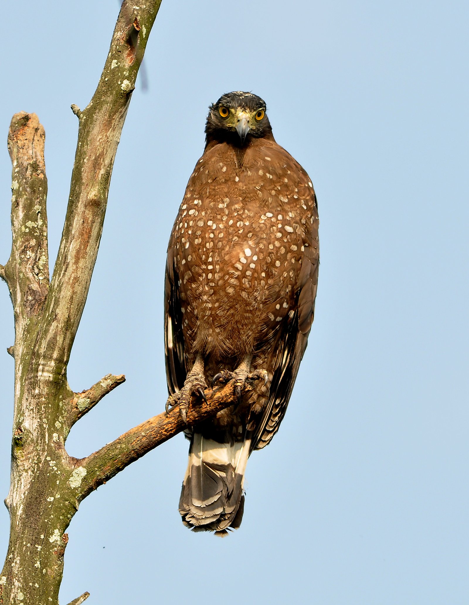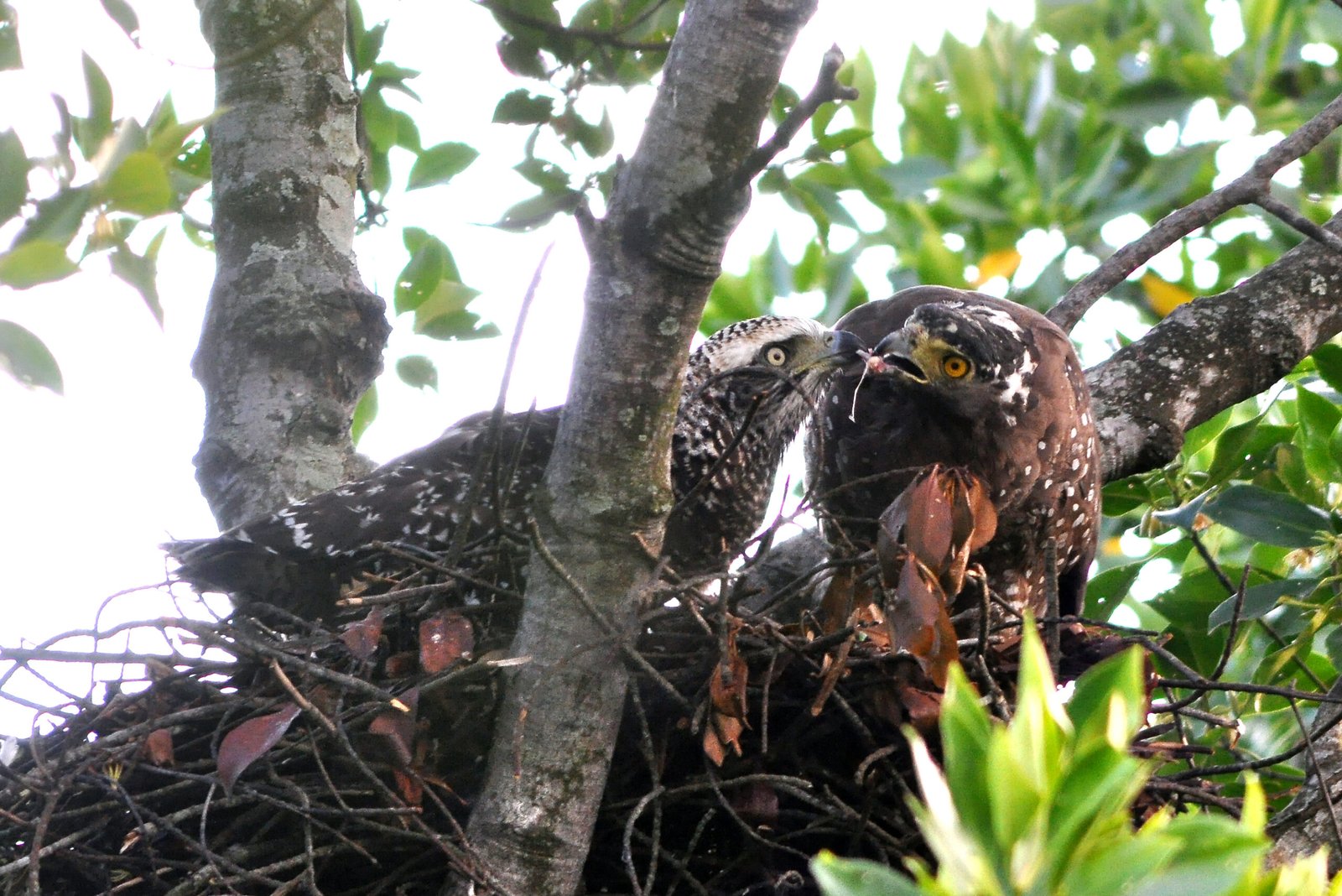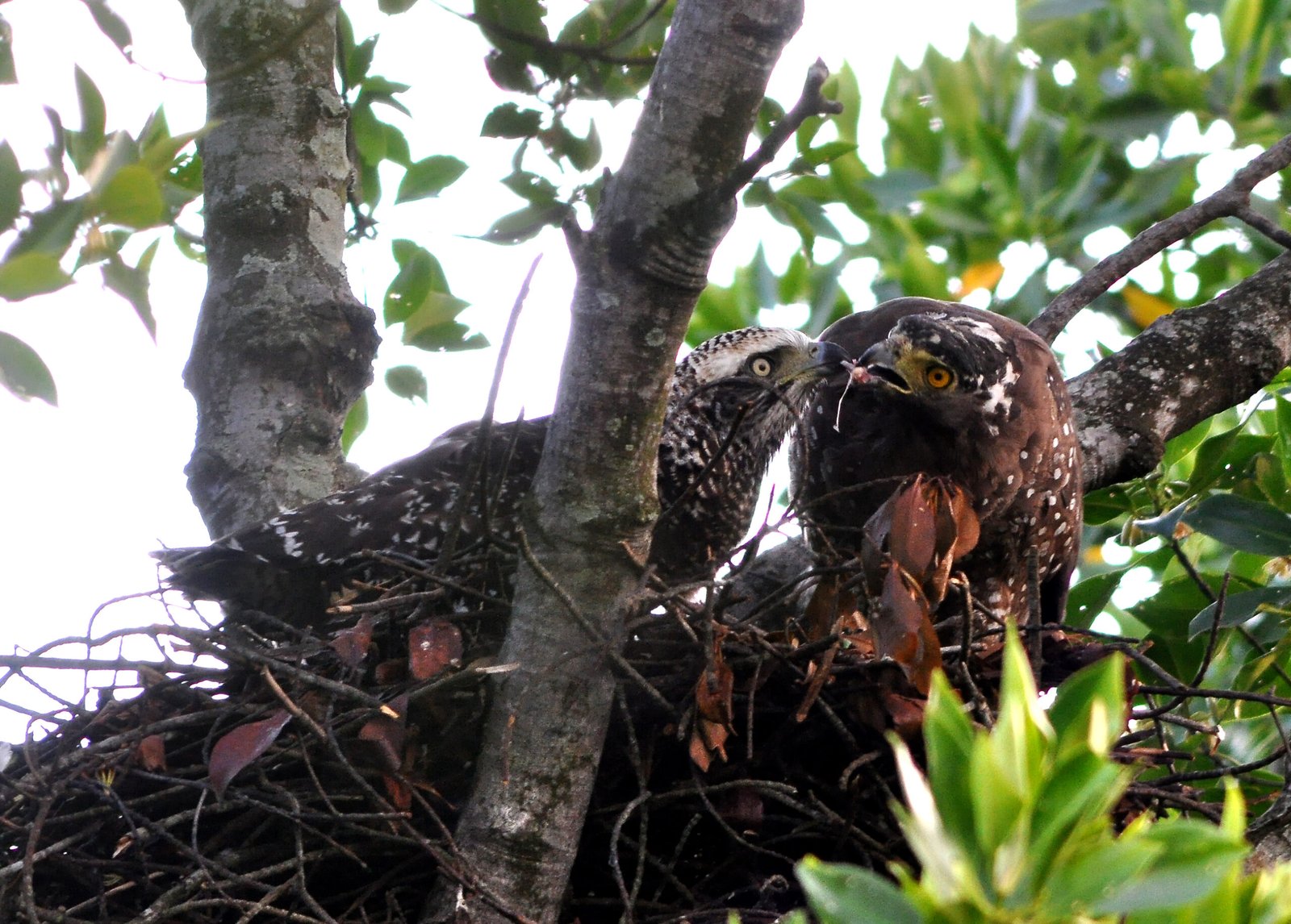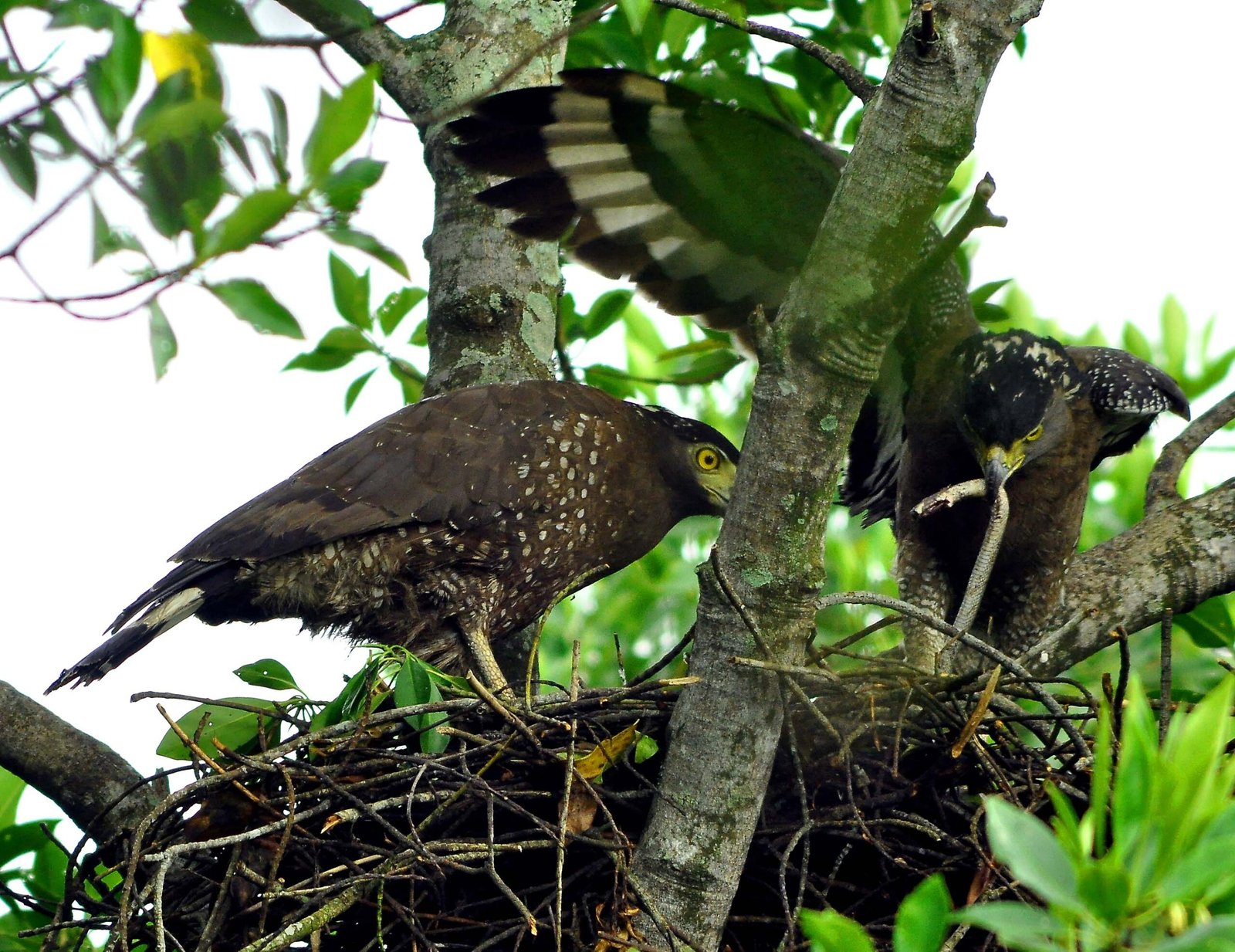 The Crested Serpent Eagle is a distinctive medium to large size Asian raptor known for its black-and-white crest, brown plumage with white barring, specializing in hunting snakes and reptiles, less commonly amphibians over forested and even sub-urban areas bodering mangroves, orchads and planatations. This majestic bird of prey uses broad wings to soar and has a loud, high-pitched call, often perching and hunting from above, though it will follow prey onto the ground.
