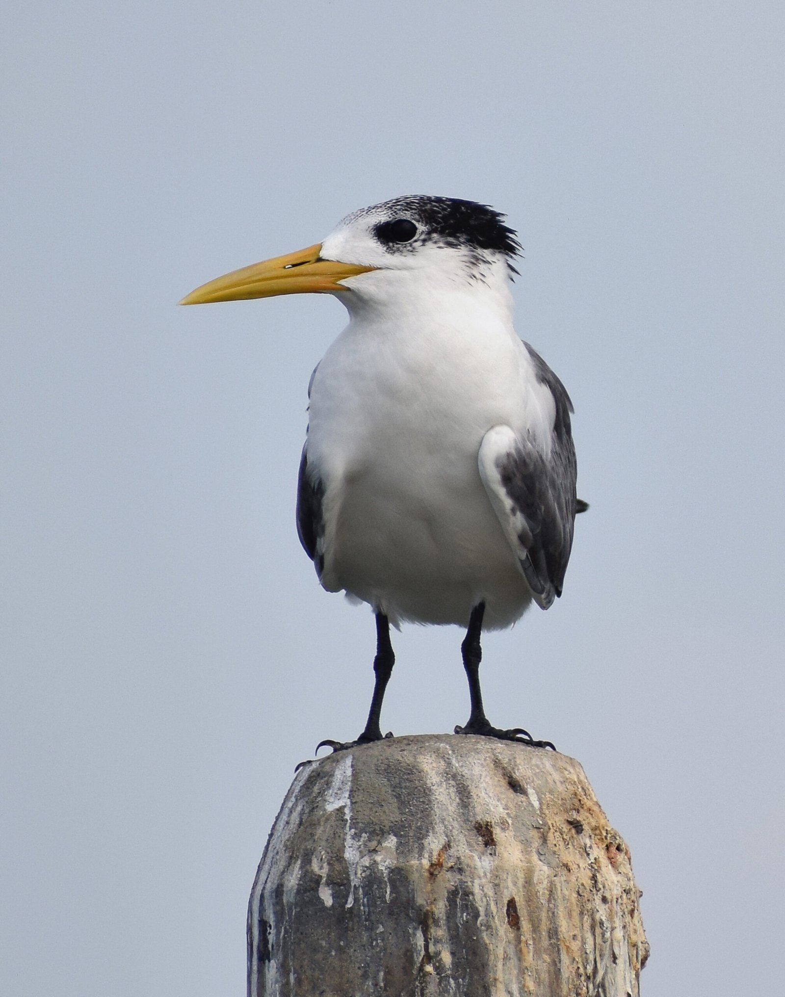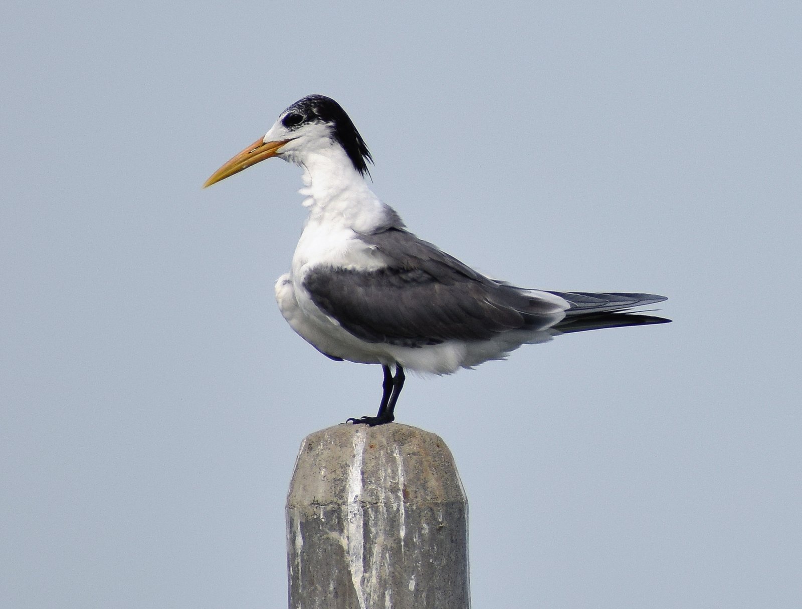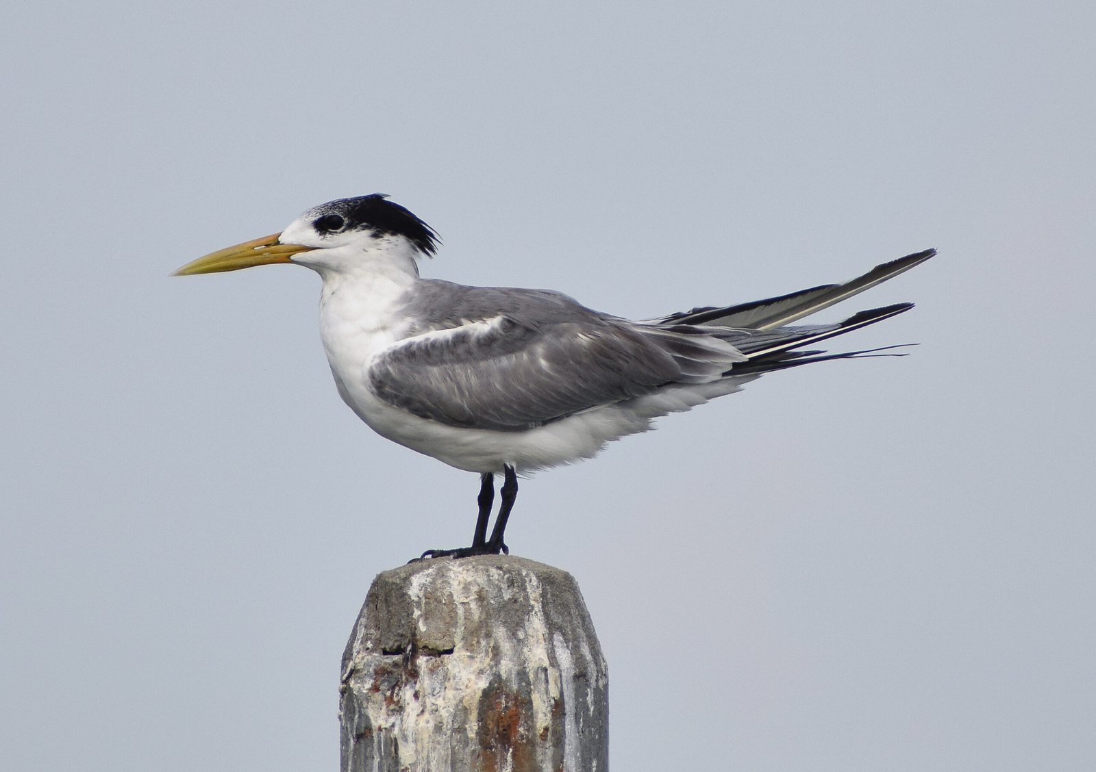 The Greater Crested Tern is a large, distinctive seabird known for its shaggy black crest, long yellow bill, grey back, white belly, and black legs, often seen along tropical/subtropical coasts worldwide.