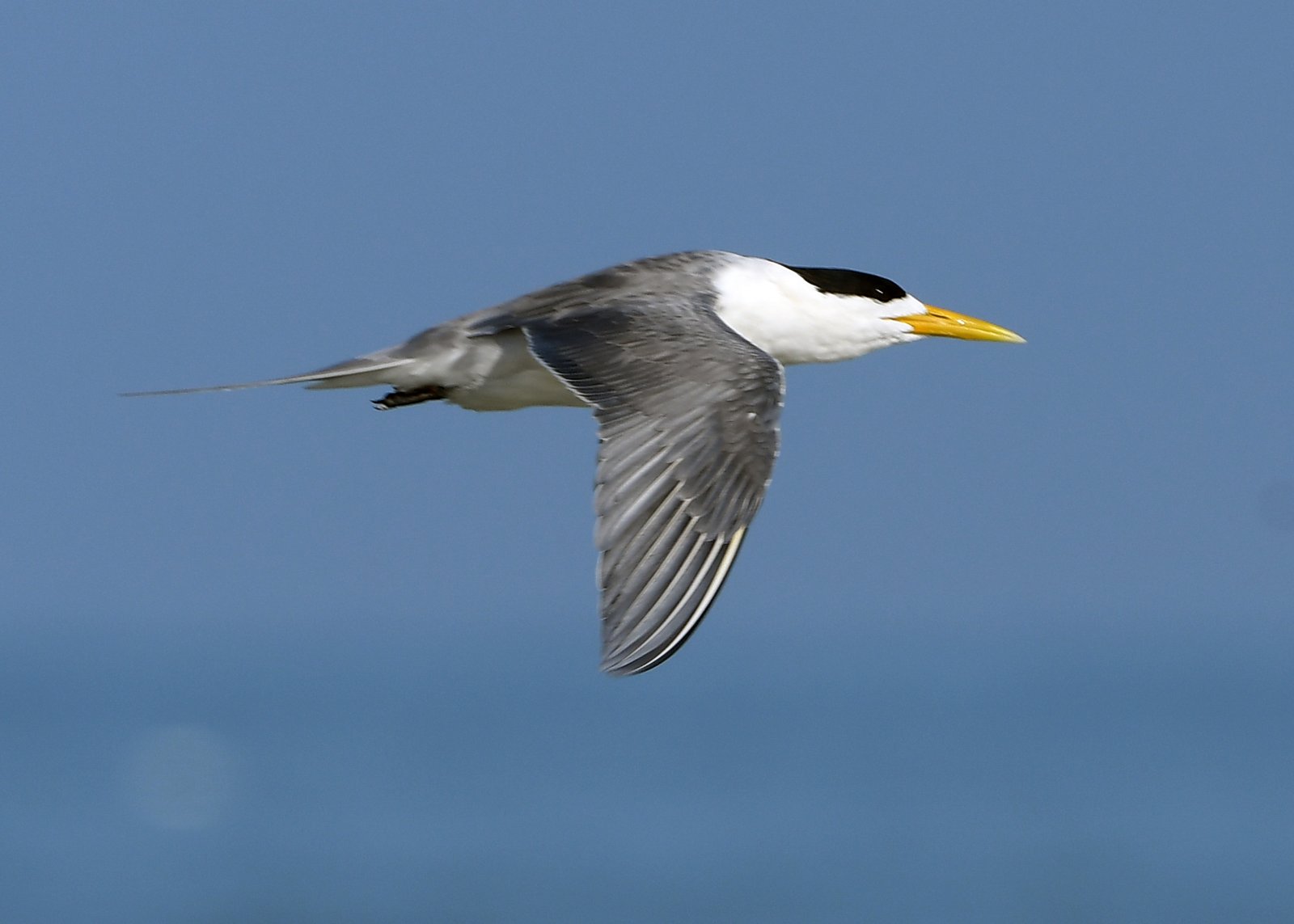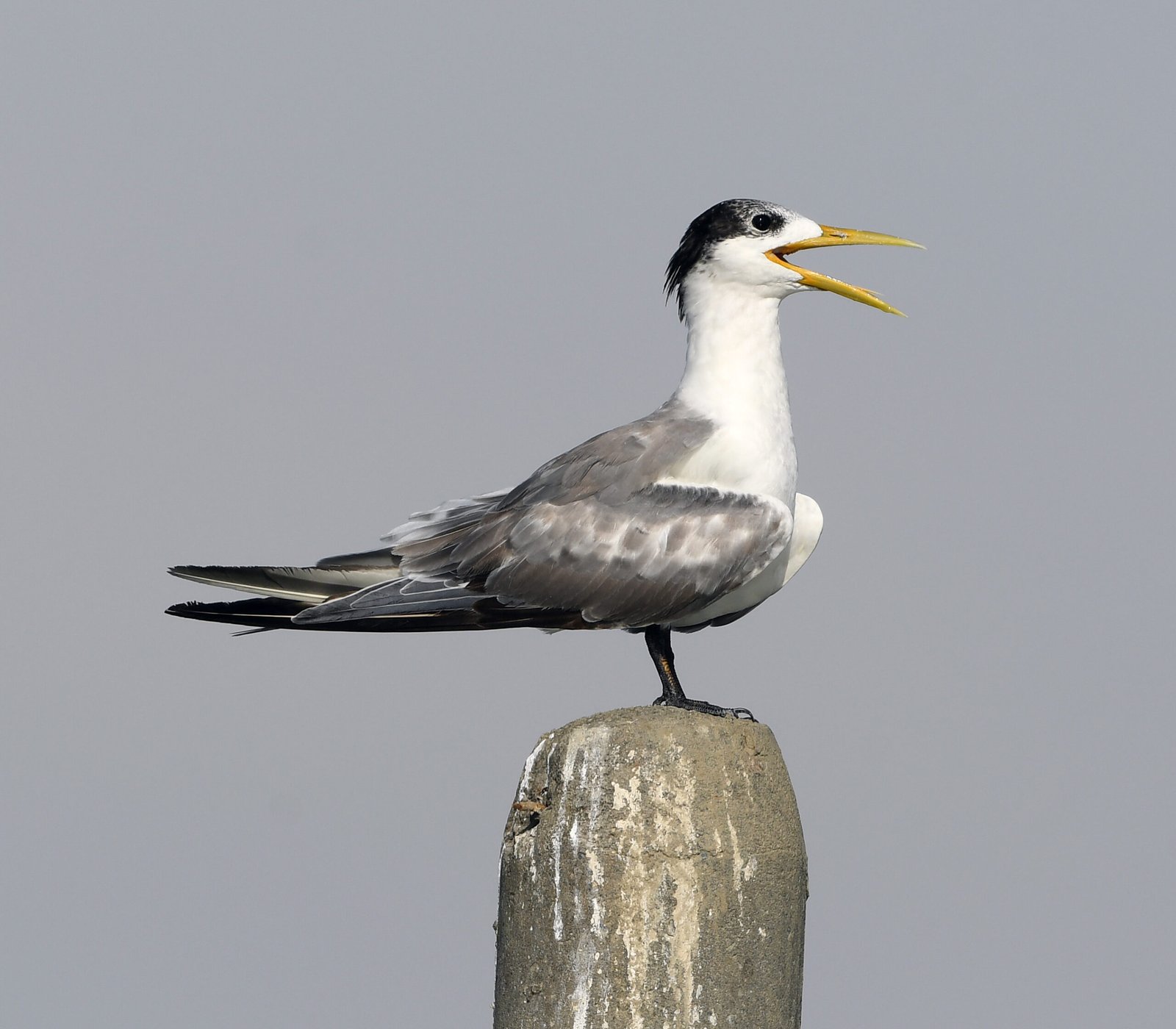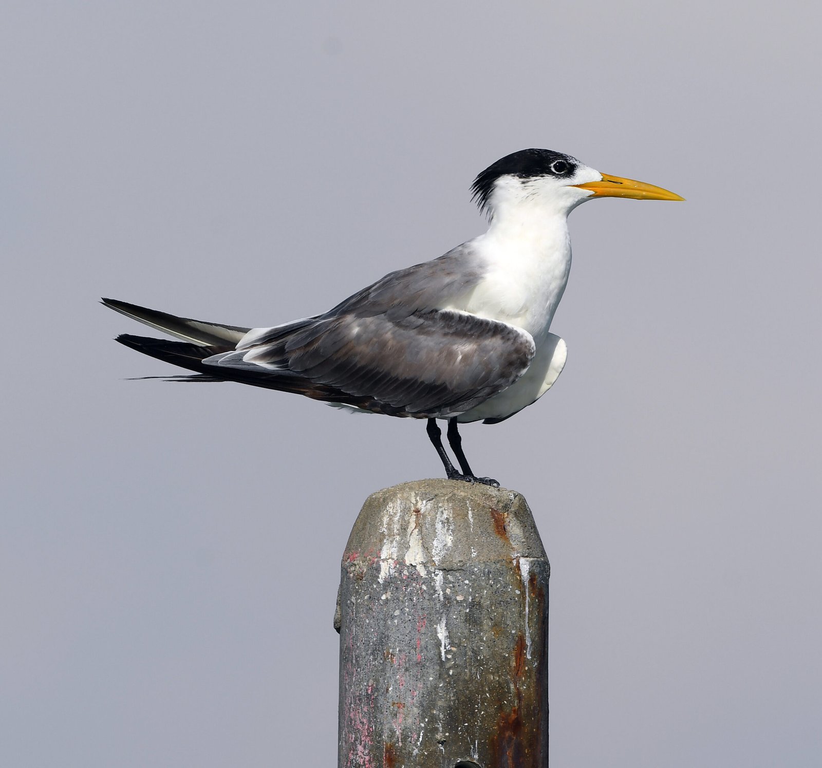 The Greater Crested Tern is a large, distinctive seabird known for its shaggy black crest, long yellow bill, grey back, white belly, and black legs, often seen along tropical/subtropical coasts worldwide.