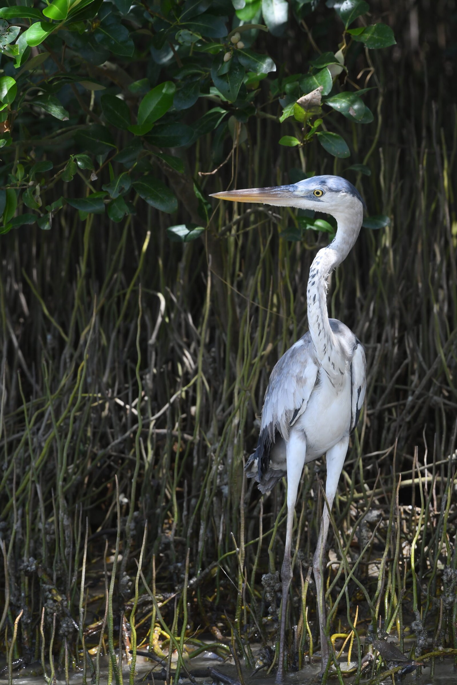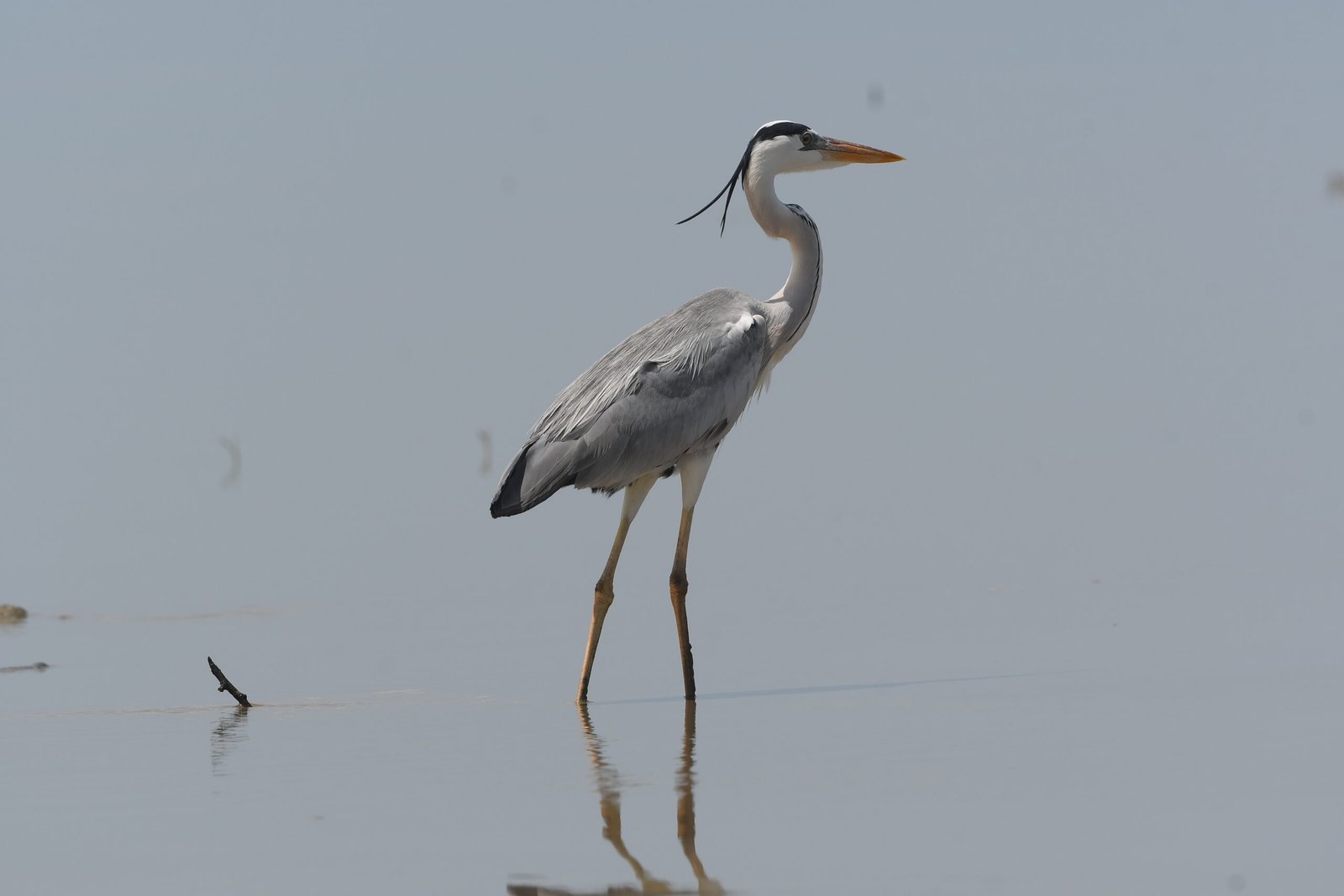 The grey heron (Ardea cinerea) is a large, long-legged, predatory waterbird having a grey back, a long white neck, a bright yellow bill, and a black eye stripe that extends into long, drooping feathers. They are a common and conspicuous sight in various wetland environments, including marshes, tidal flats, ponds, and rivers.