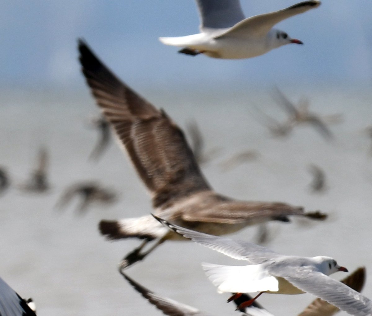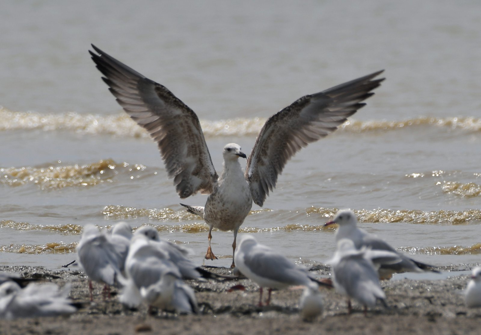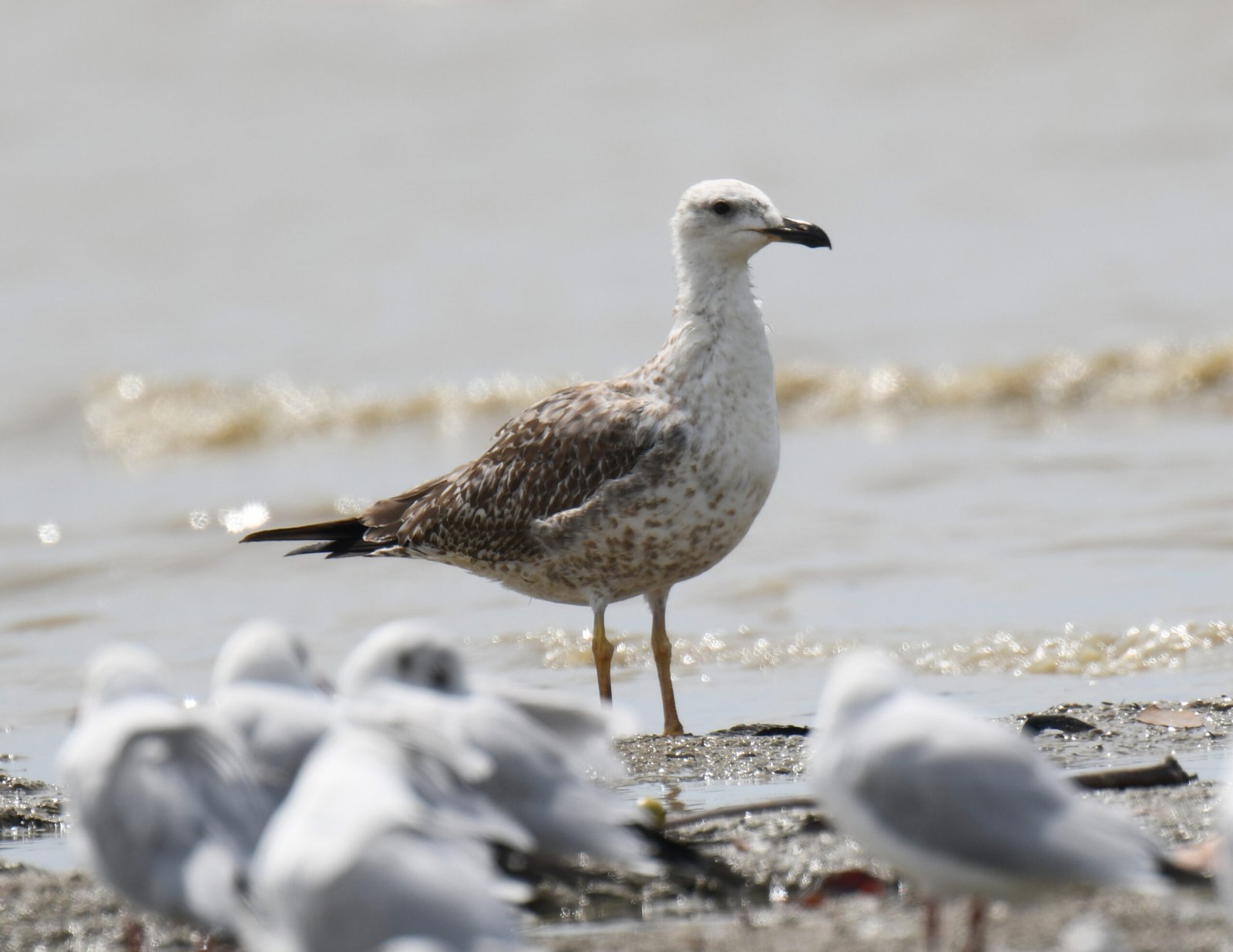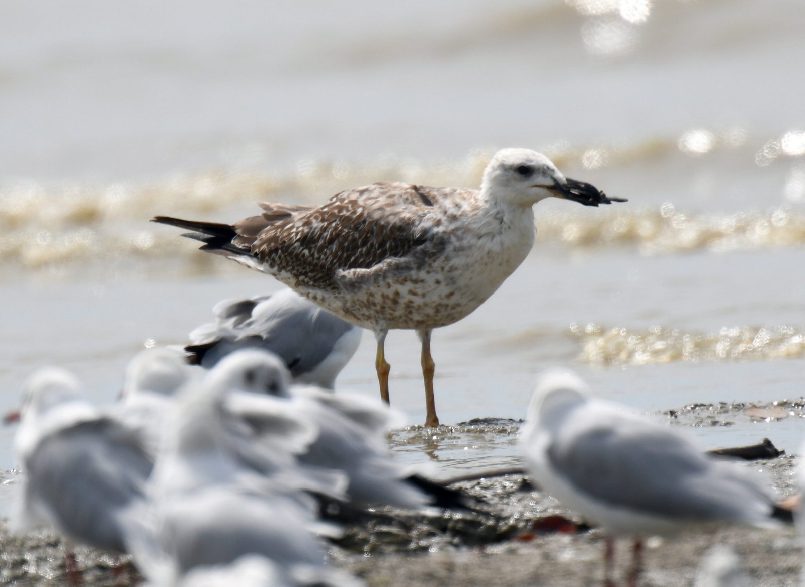 Immature Lesser Black-backed Gulls (as depicted by above photos) look very different from adults, starting as mottled brown/grey juveniles with dark bills and tail bands, gradually gaining sleeker, checkered brown/white patterns with paler heads, blackish wings, and eventually developing the adult’s dark grey back and yellow legs over 3-4 years, But the non-breeding adult Lesser Black-backed Gull is most distinctly identified by its dark gray back, yellow legs, and dusky brown streaking on the head and neck.