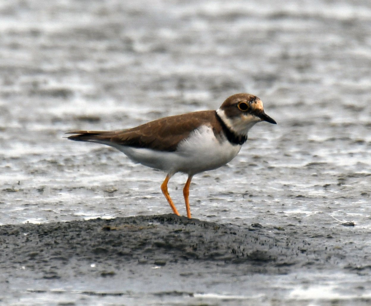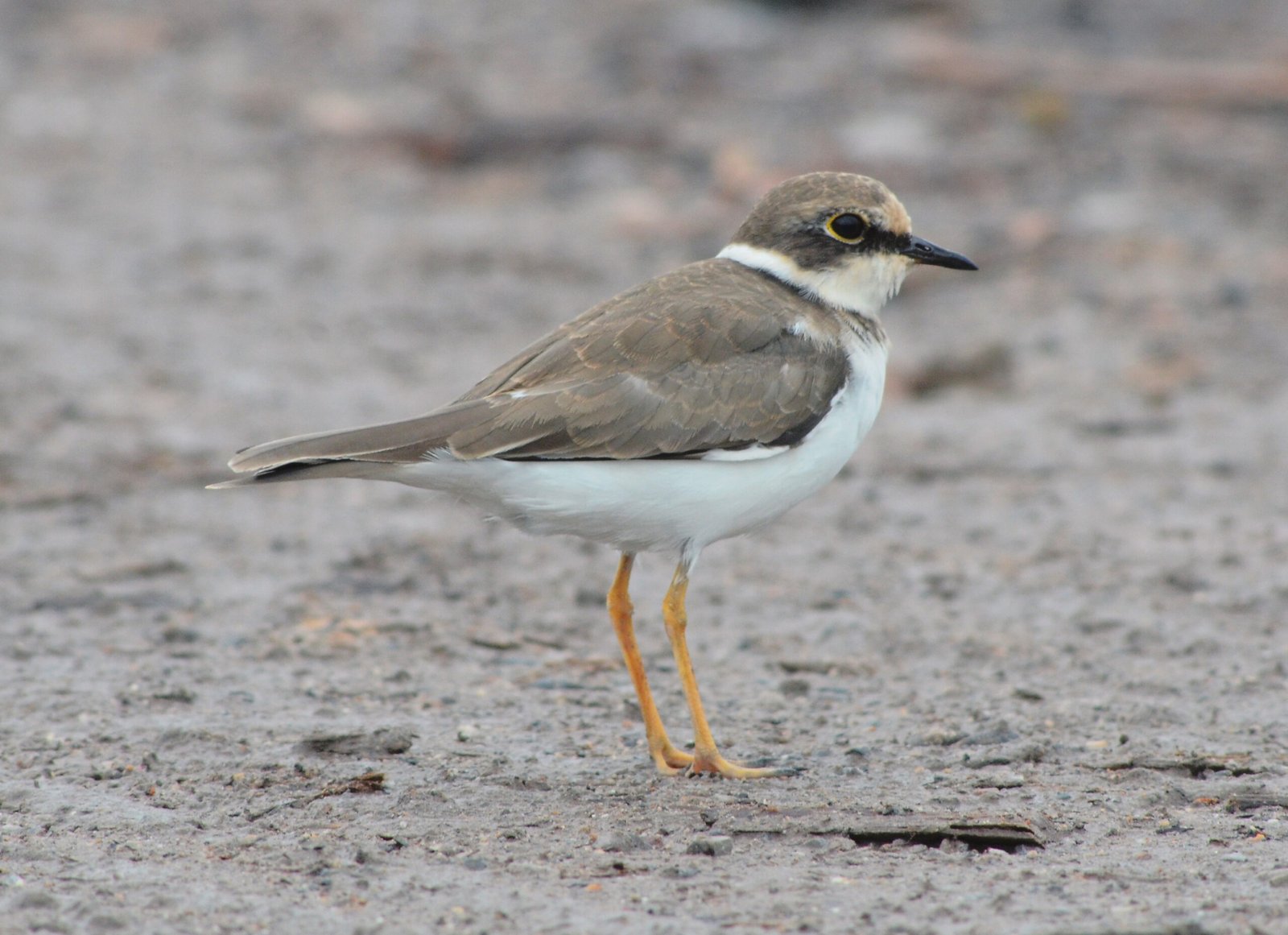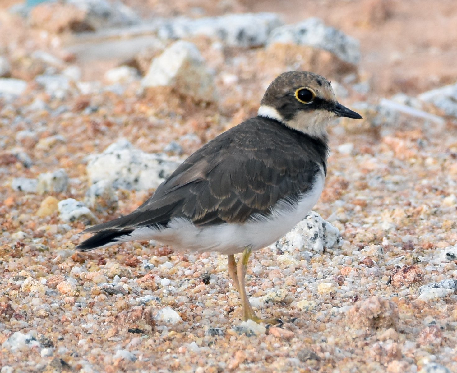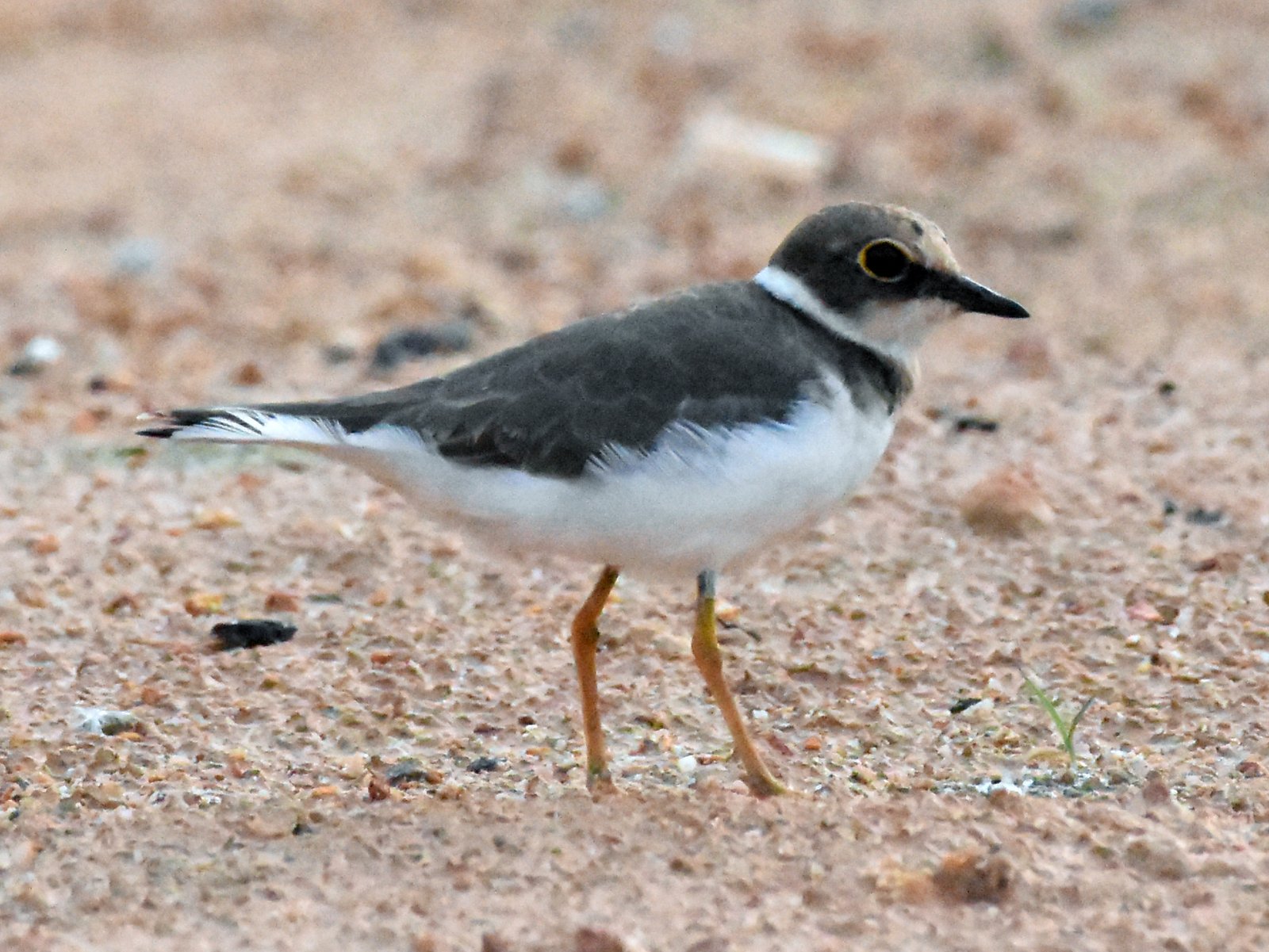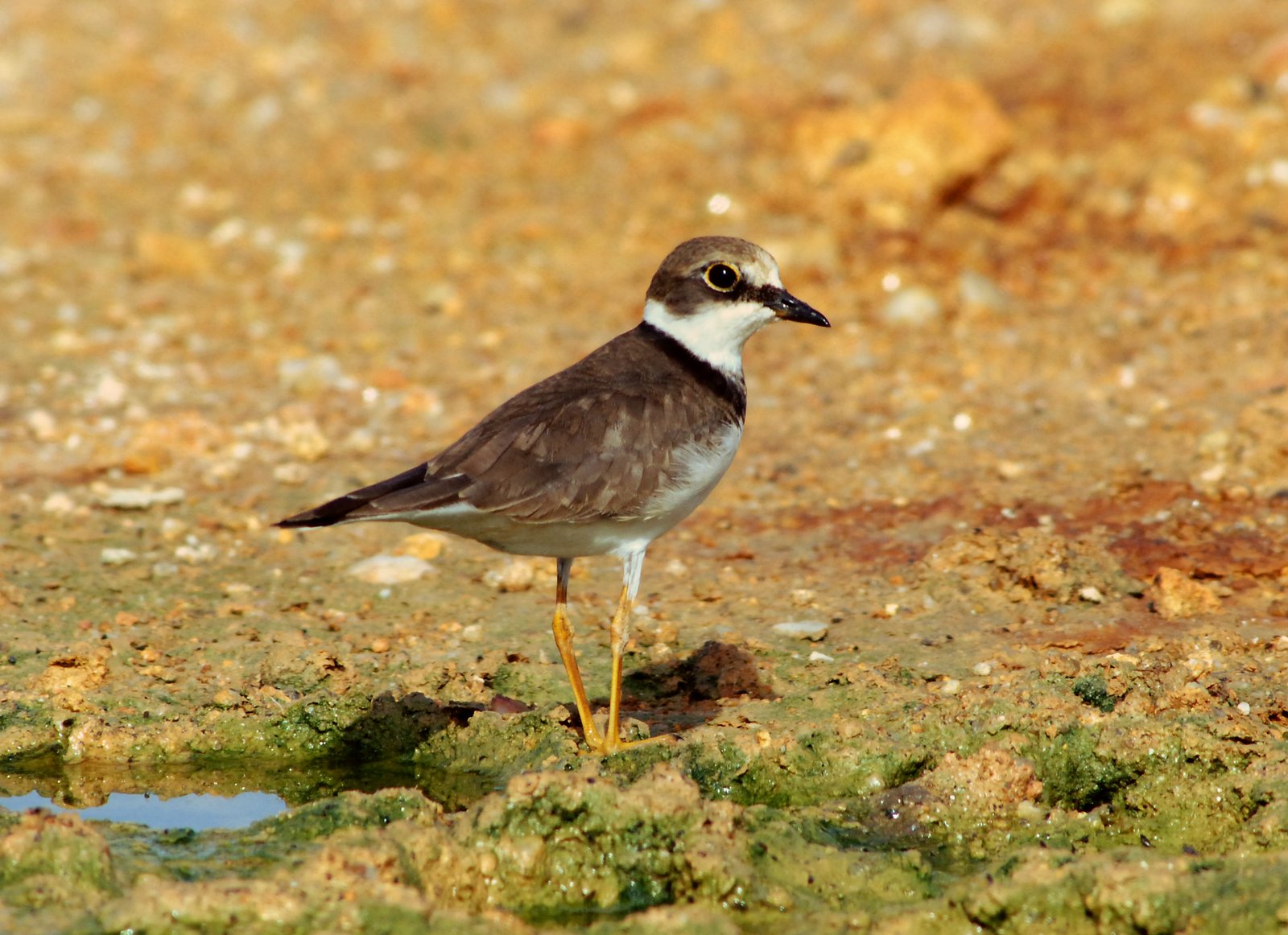 A small, dainty shorebird/wader known for its distinctive yellow eye-ring, black bill, and black chest-band, pale (creamy-brown/pinkish) or yellowish legs.