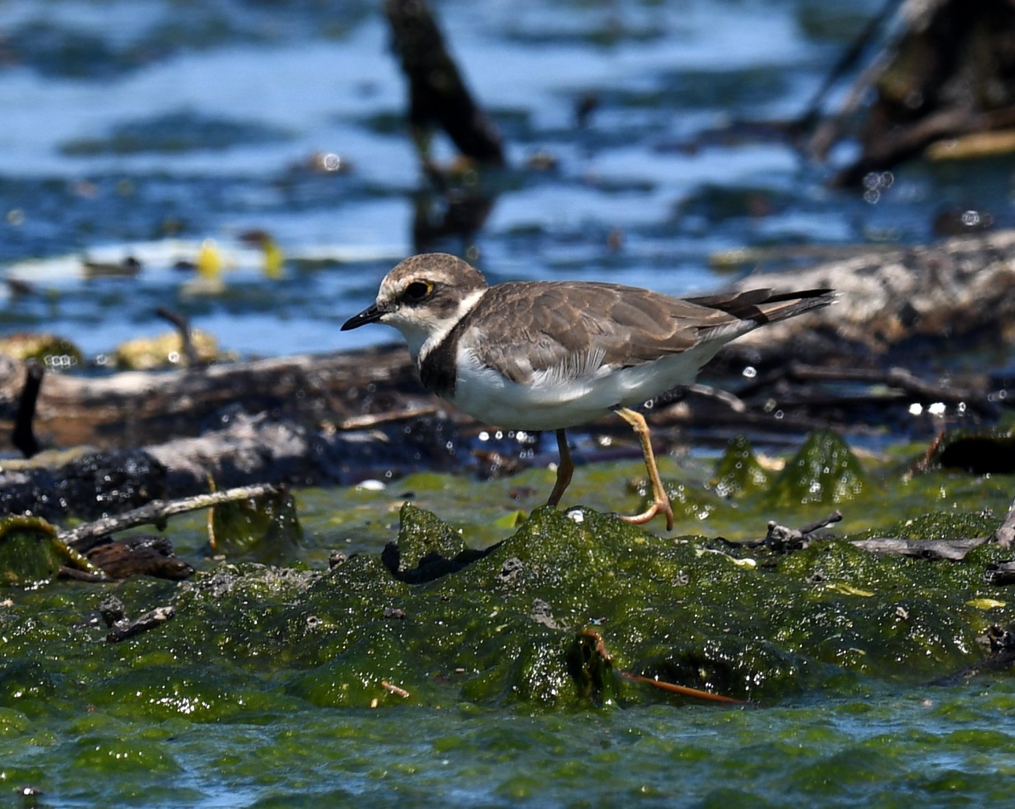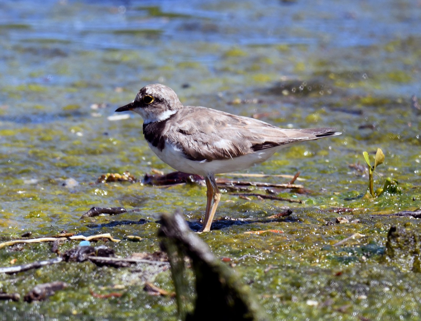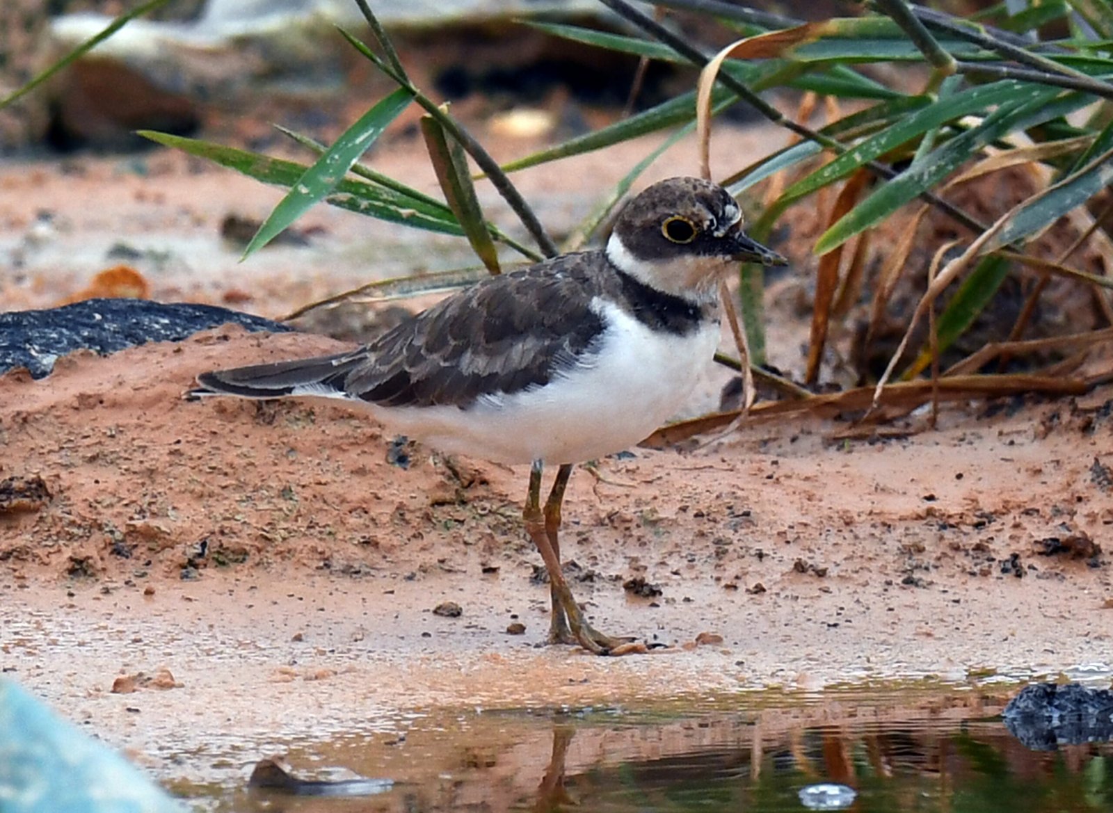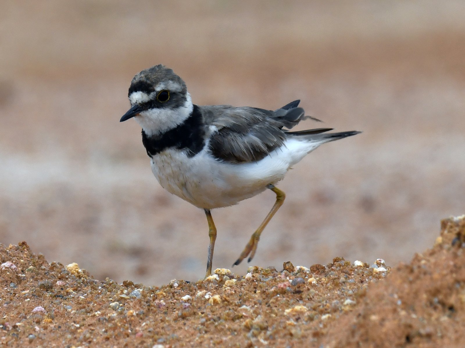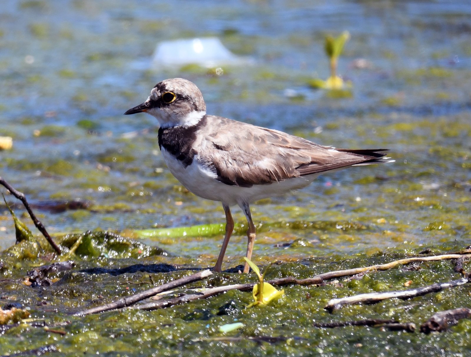 The Little Ringed Plover (Charadrius dubius) is a small, delicate shorebird known for its bright yellow eye-ring, black bill, pale legs or flesh-colored legs (unlike the orange legs of the Common Ringed Plover) and distinctive black and white head pattern.