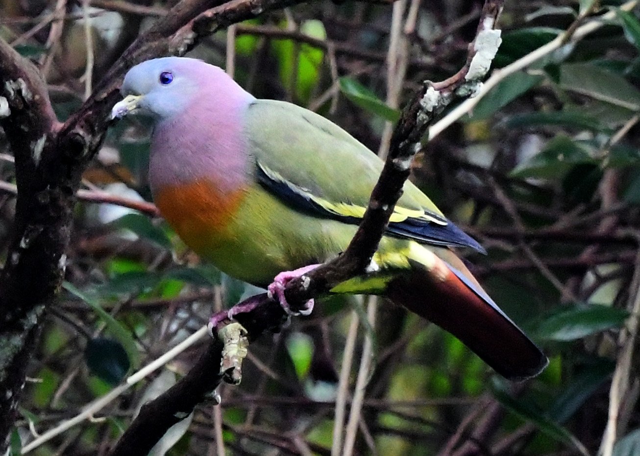 The Pink-necked Green Pigeon is a vibrant Southeast Asian bird, known for the male’s namesake pink neck, green body, and striking black & yellow wing patches, while the female is plainer green. Common throughout, especially orchards, secondary forest, forest edge, mangroves, plantations, paddyfields with hedges, sub-urban areas with fruiting or wild fig trees.