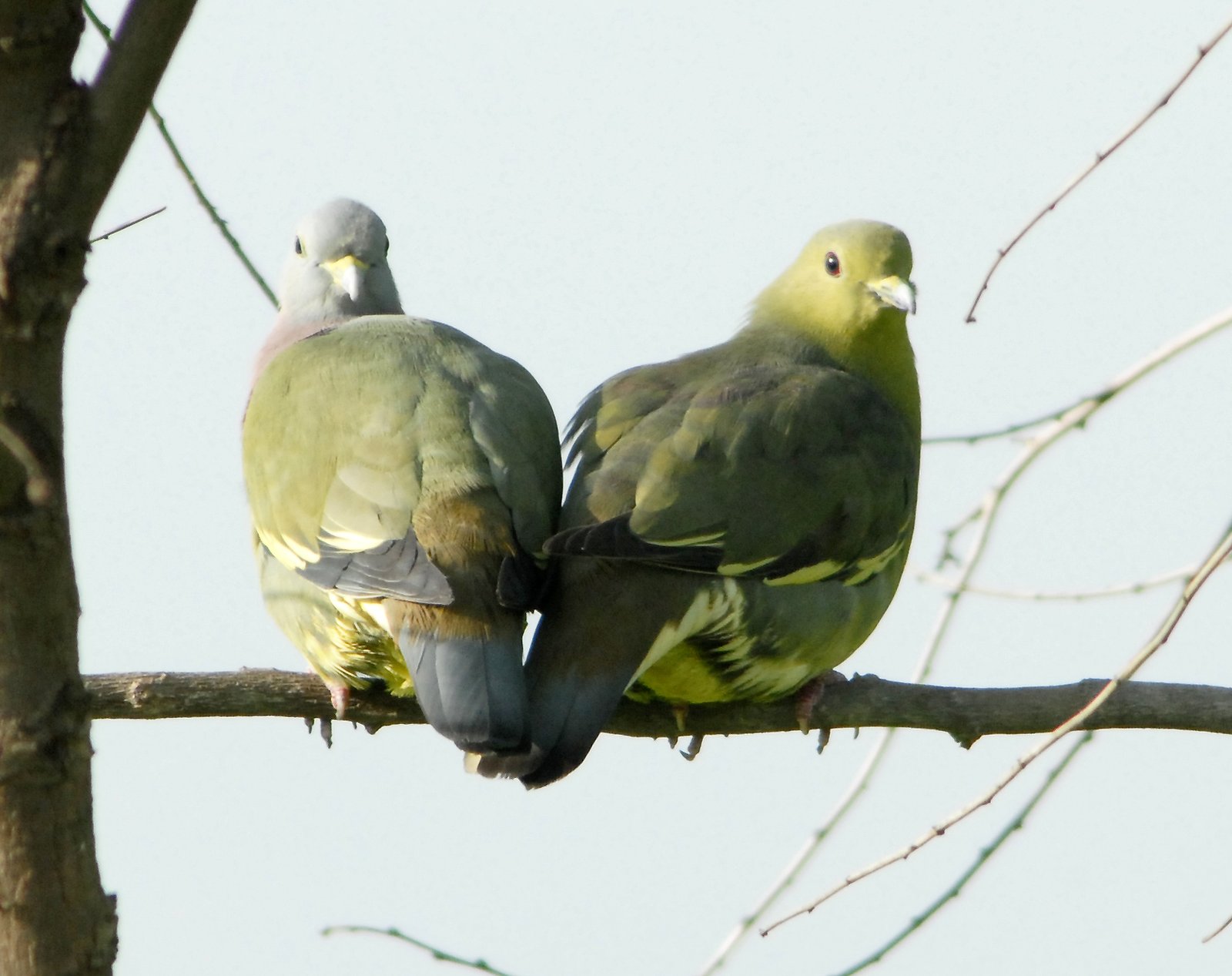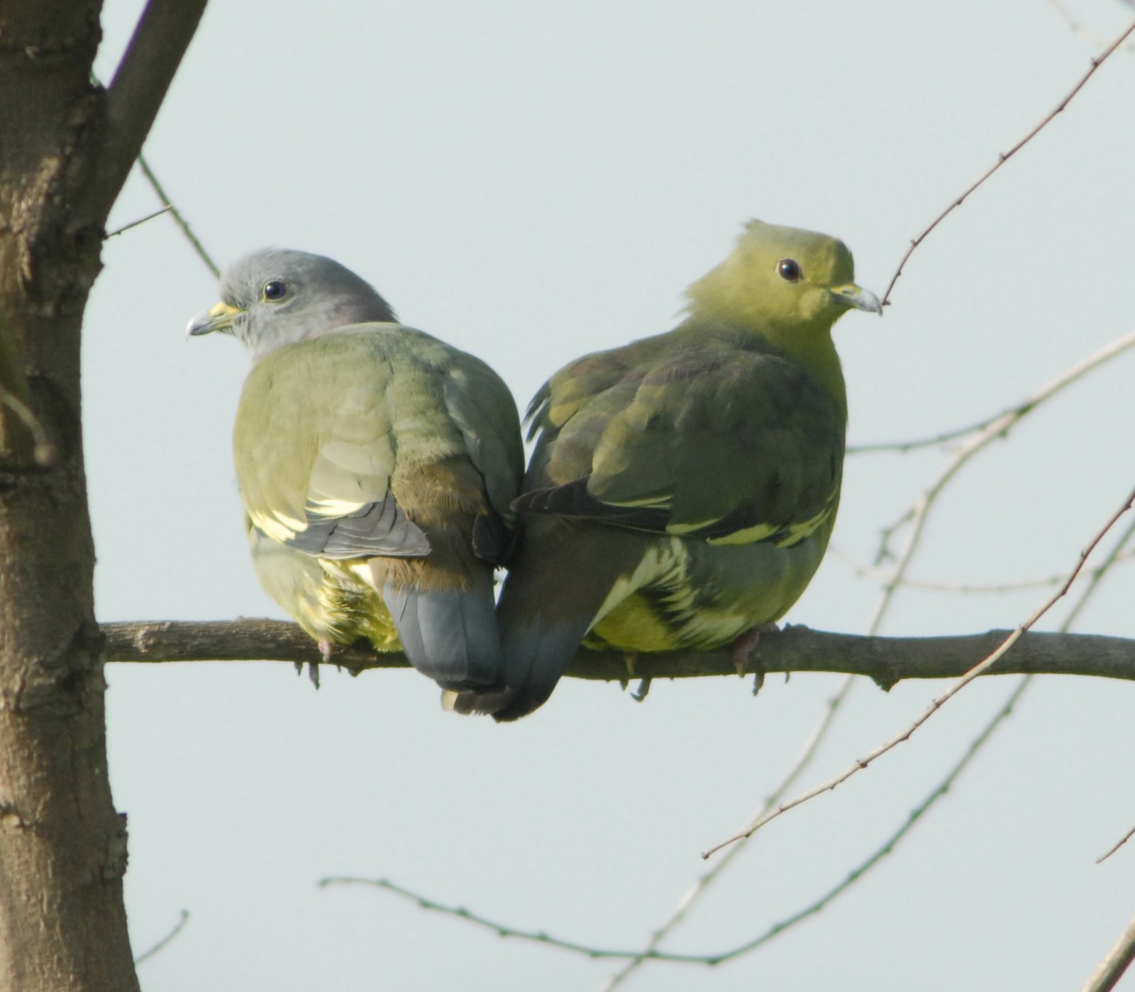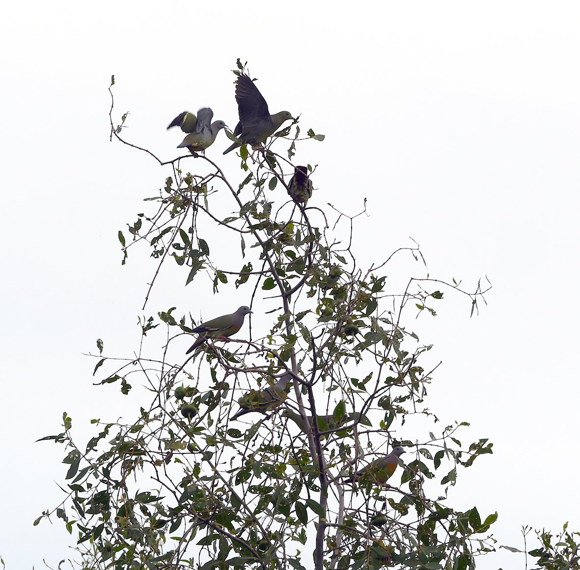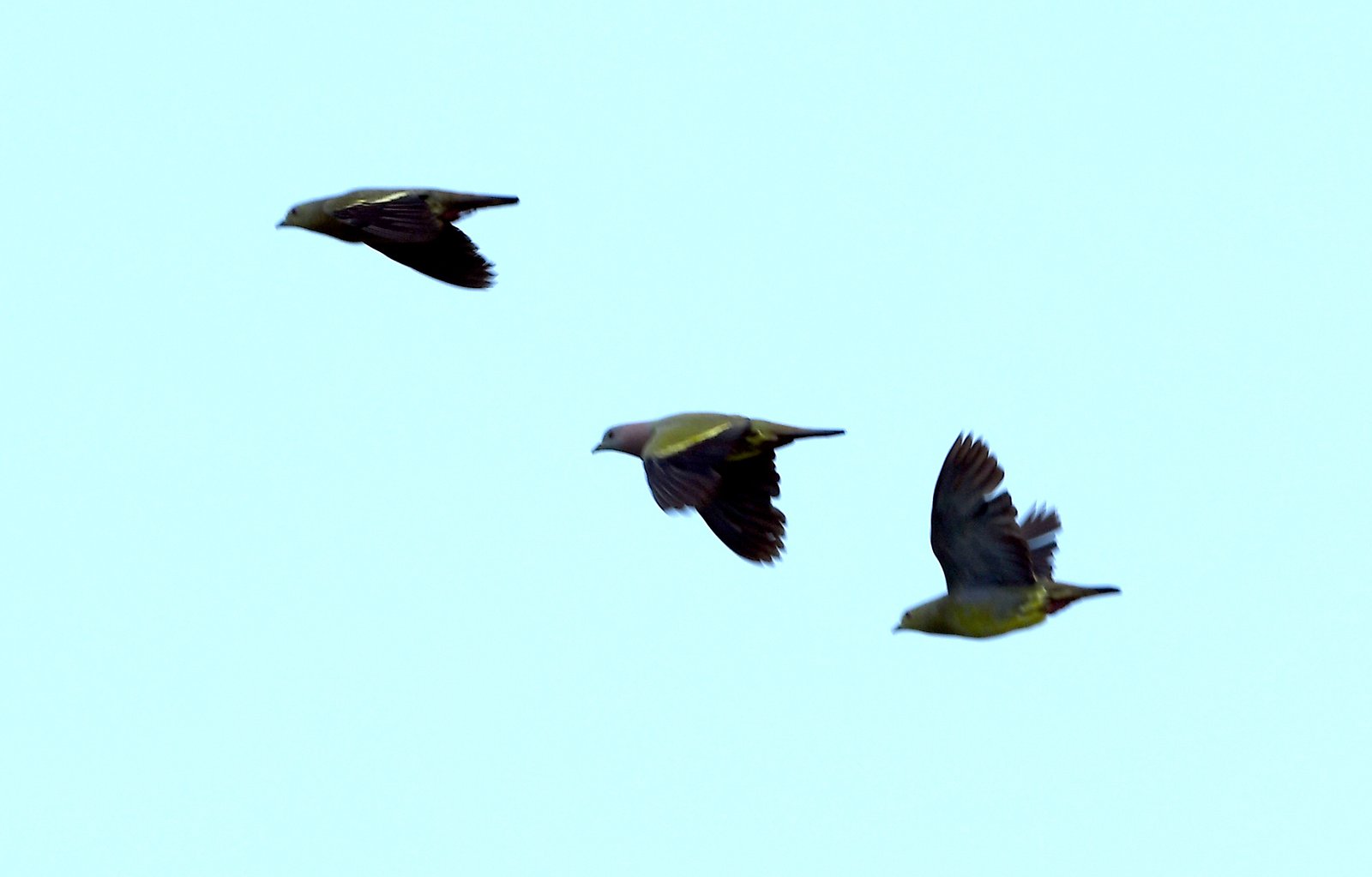 Males have a powder-pink neck, orange breast, gray-blue head; females are duller green; both have bright yellow-green undersides and black/yellow. Have a unique cooing sound if learned, you will this pigeon very common all over Seberang Perai. Flocks of up to one-hundred is not uncommon, although usually in tens.