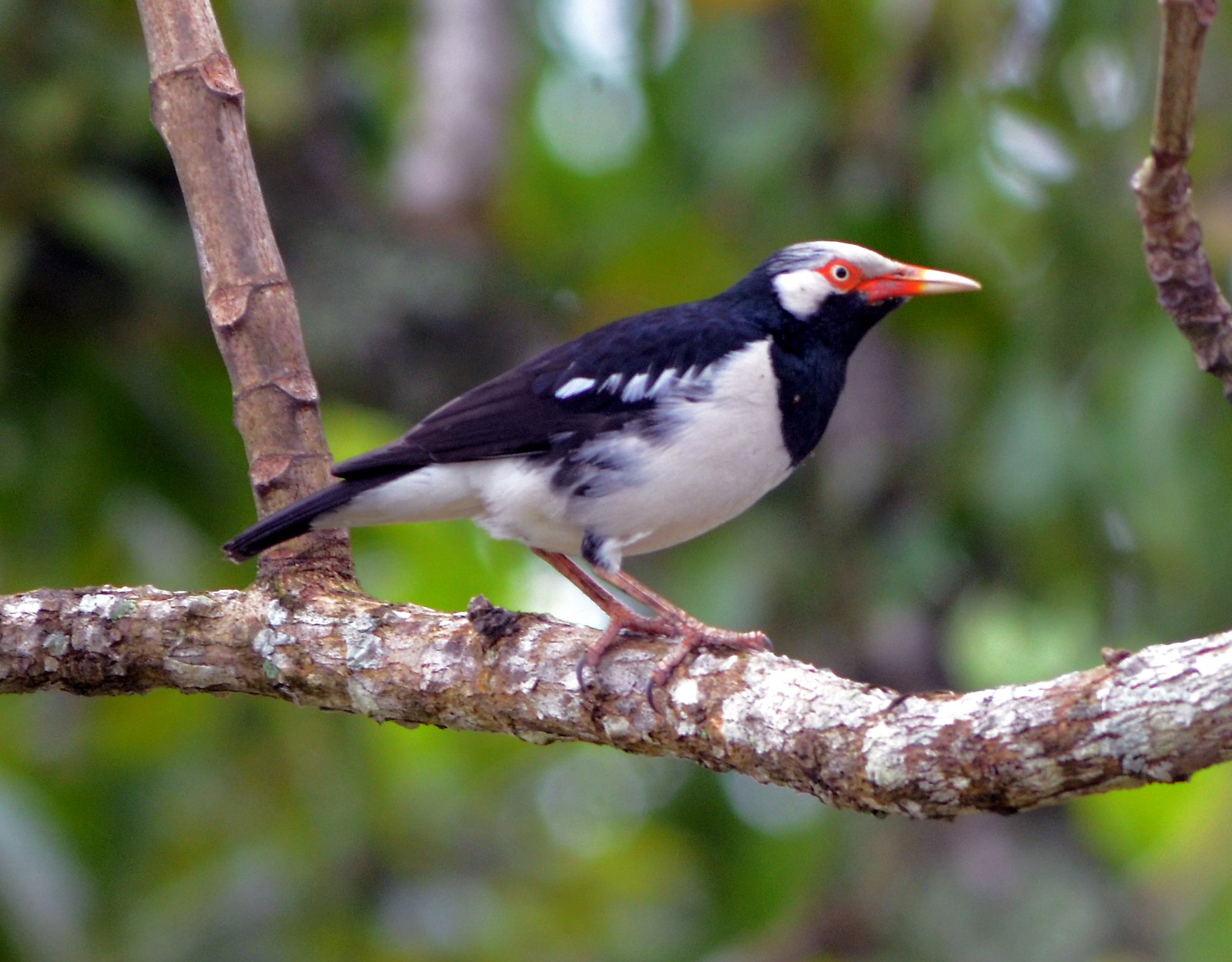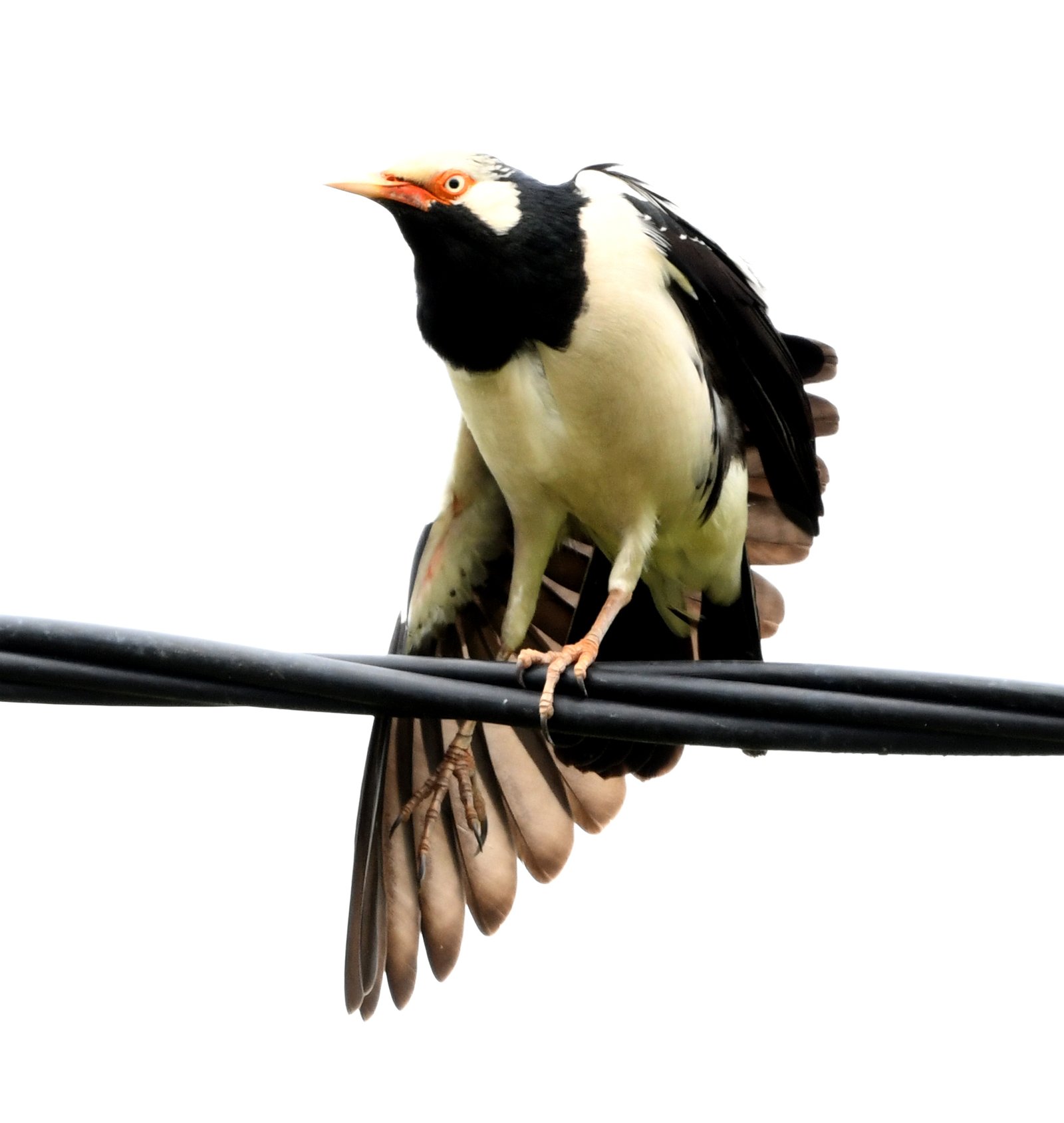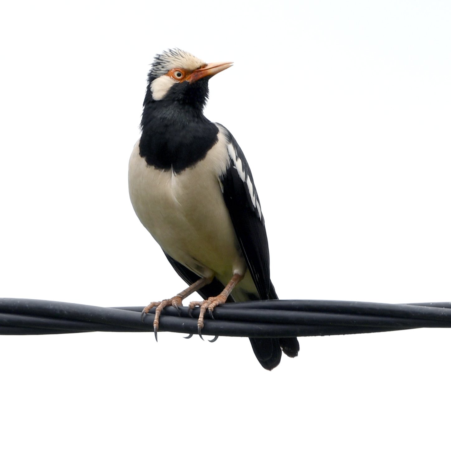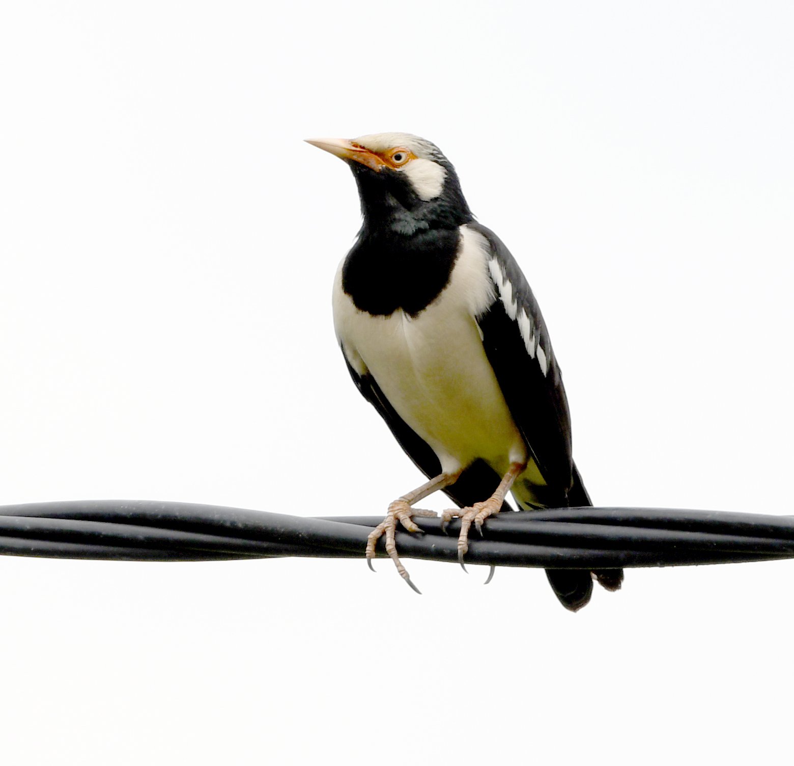 The Siamese Pied Starling is a medium-sized, highly vocal, black-and-white bird found in SE Asian open habitats. It features a glossy black hood, mantle, and chest, contrasting with white underparts, a white nape, and a white stripe above the eye. Distinctive features include a long, yellow-based bill with orange-red skin around the eye.