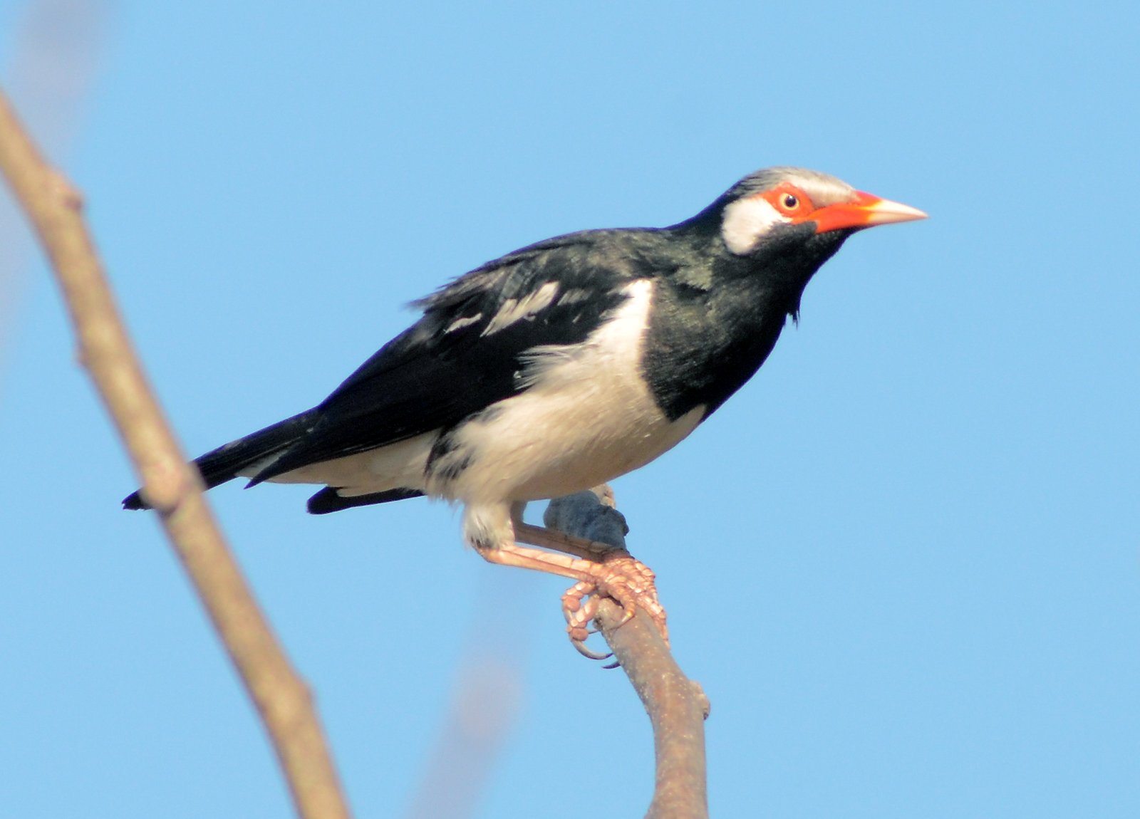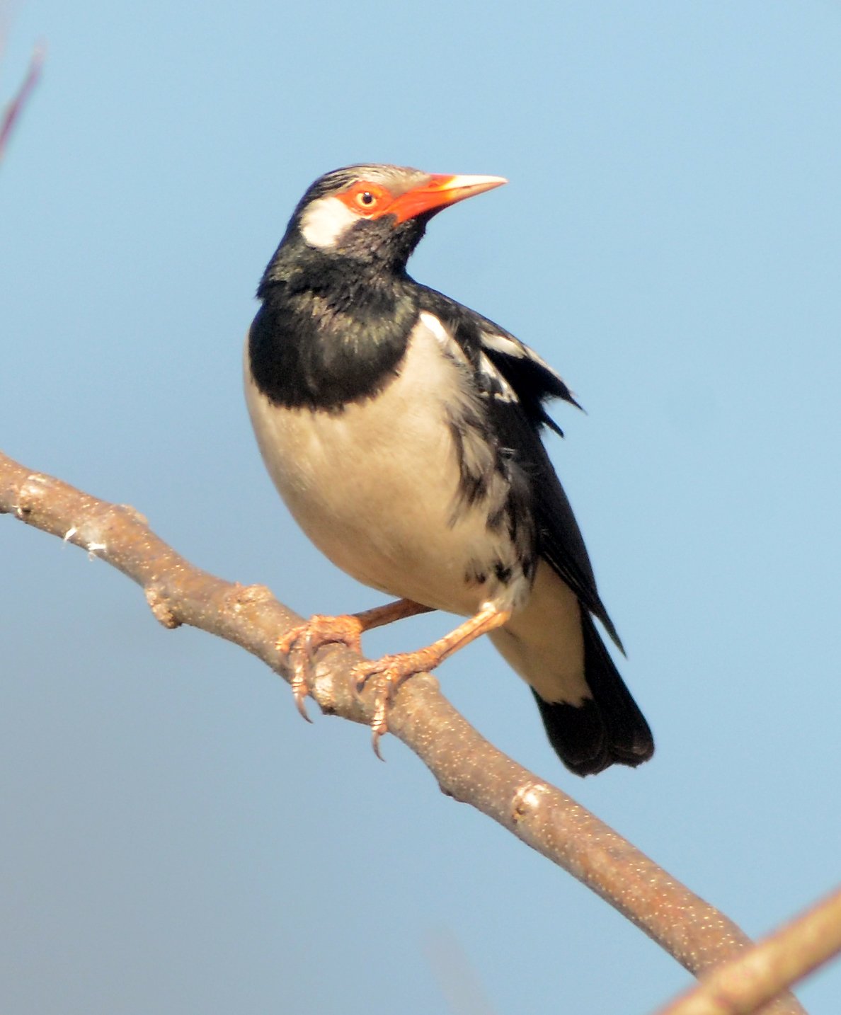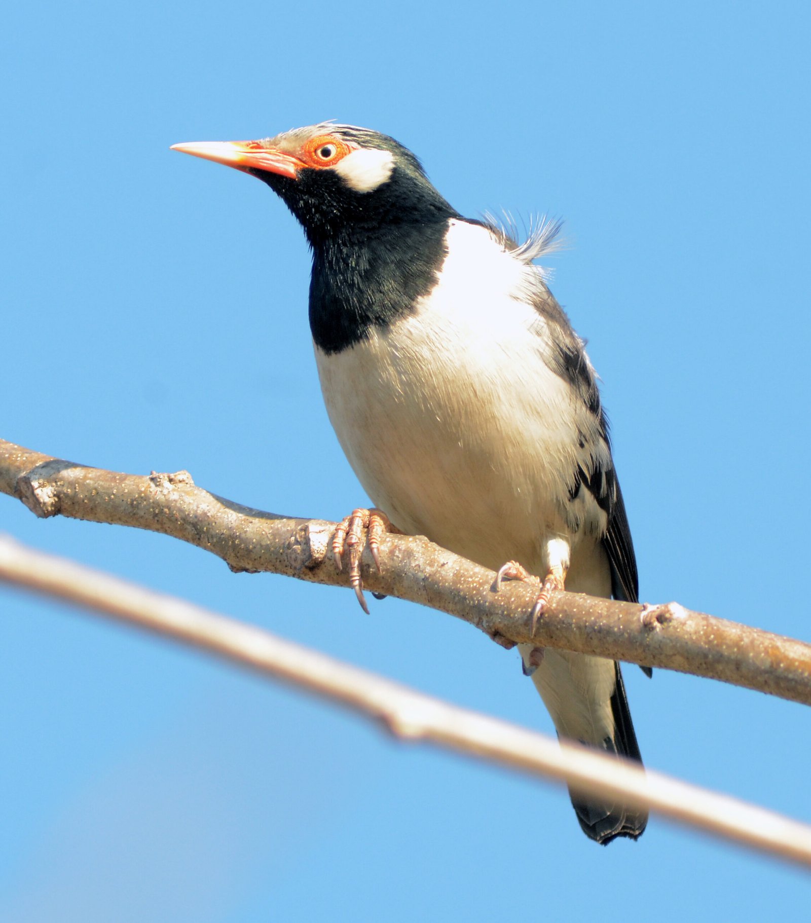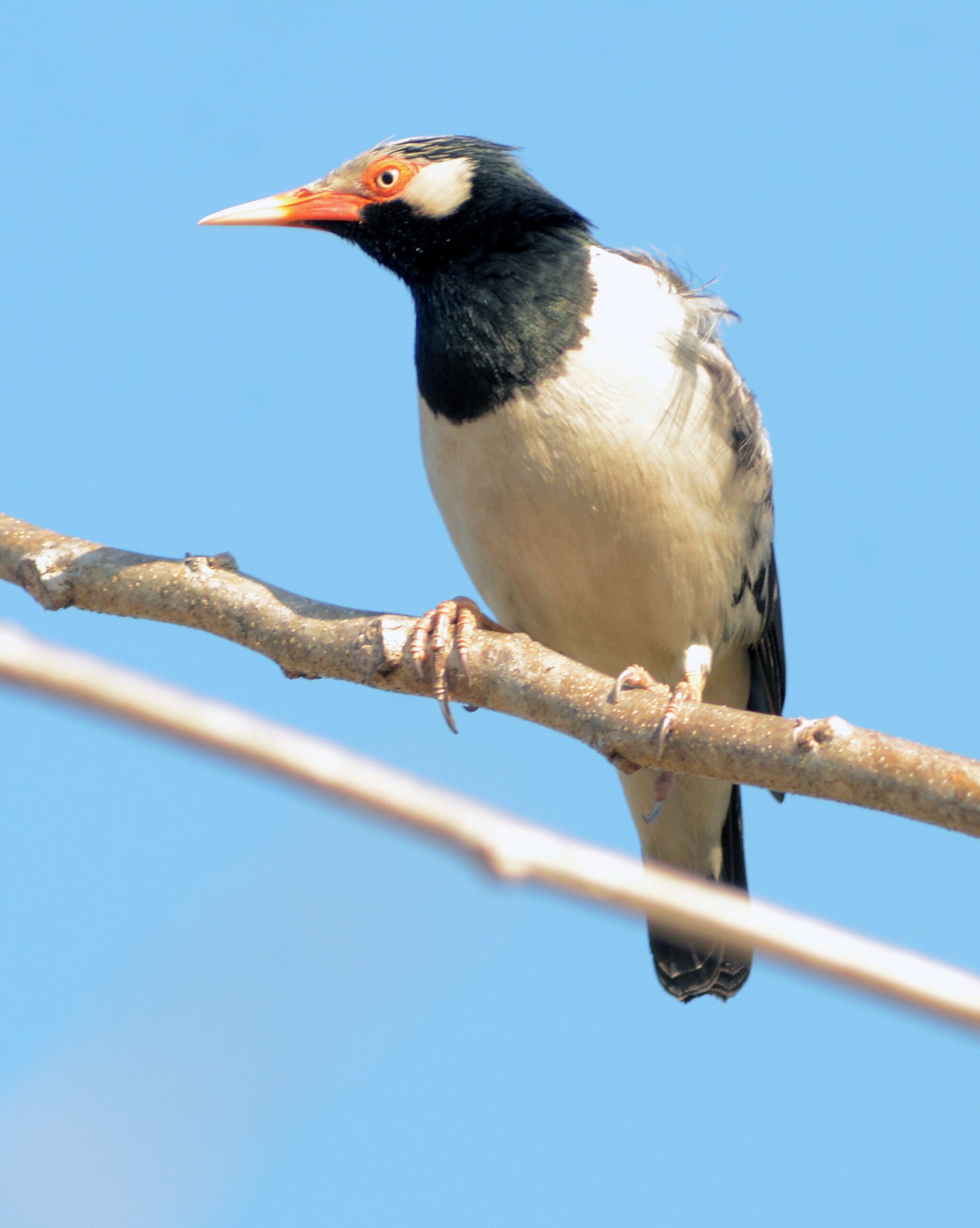The Siamese Pied Starling is a medium-sized, highly vocal, black-and-white bird found in SE Asian open habitats. It features a glossy black hood, mantle, and chest, contrasting with white underparts, a white nape, and a white stripe above the eye. Distinctive features include a long, yellow-based bill with orange-red skin around the eye.