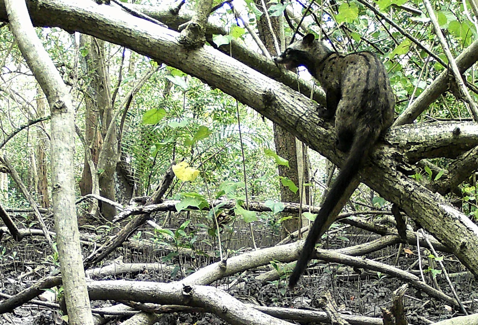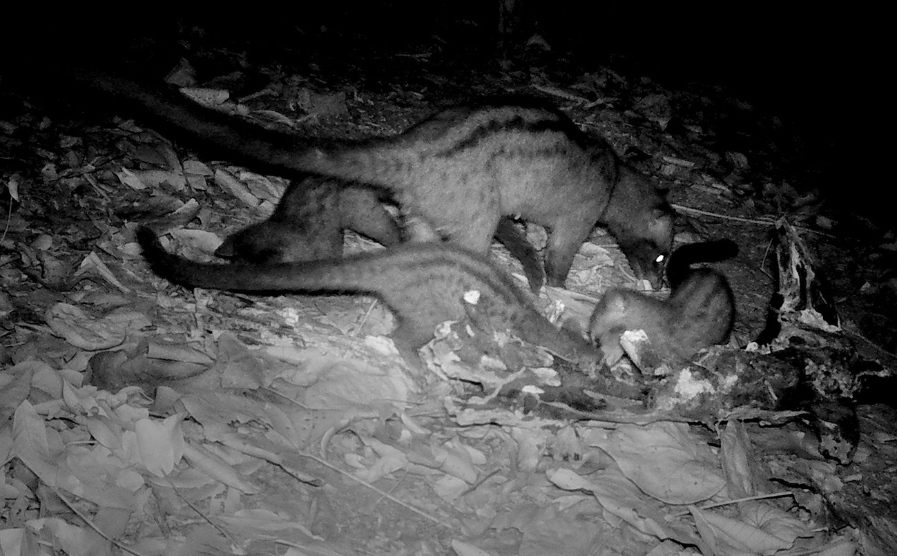 The Asian palm civet, also known as the toddy cat or musang, is a slightly larrger than a domestic cat mainly nocturnal mammal native to South and Southeast Asia. The civet has a long body, short legs, a pointed snout, and dark grey or black fur with a distinctive black “mask” band across its eyes.