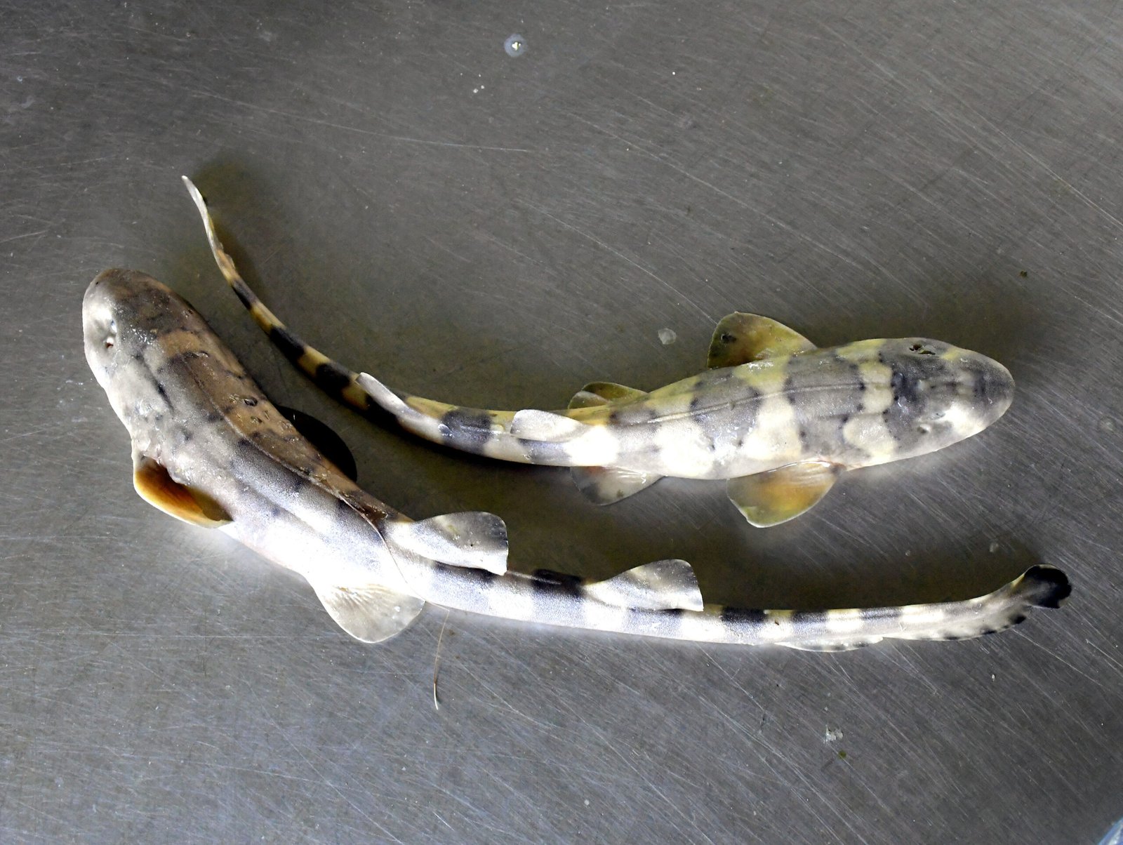 The brown-banded bamboo shark is a small, nocturnal, bottom-dwelling shark. Juveniles have distinct dark bands that fade to a uniform light brown as they mature into adults. Found in the Indo-West Pacific, they inhabit shallow coral reefs, tide pools, and sandy/muddy bottoms. They are carnivores that feed on benthic organisms like shrimp, crabs, worms, and small fishes.
