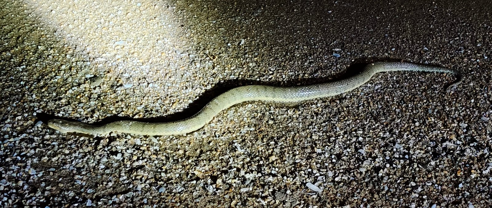 The dog-faced water snake, also known as also known as the New Guinea bockadam, South Asian bockadam, bockadam snake, is a mildly venomous, semi-aquatic snake known for its broad head and snout, resembling a dog’s face. It is greyish-brown with darker stripes with a white belly, a black line from eye to neck with eyes on top for spotting prey in brackish mangrove & estuarine waters. These Homalopsid (mud snakes) snakes are predatory specialists, eating fish and crustaceans, by ambush hunting and chasing them under water, on the tide line, and going after them by entering the various holes on the mudflats.