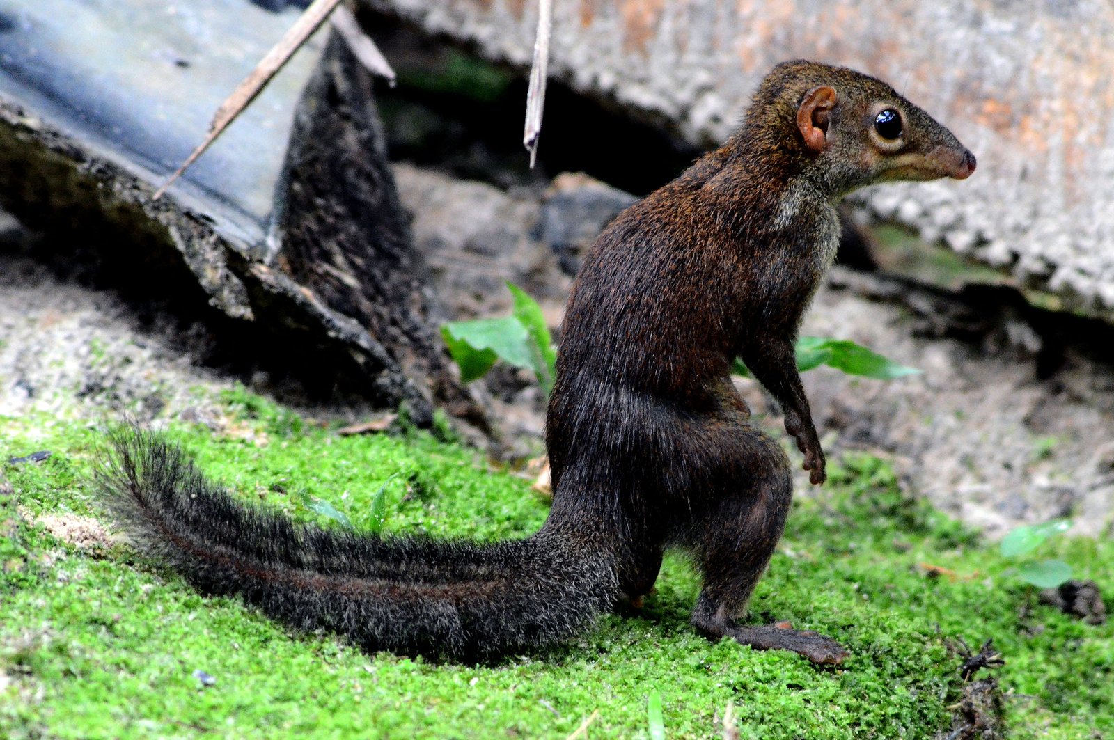 The Common Treeshrew is a small, agile, squirrel-sized mammal from Southeast Asia, known for its reddish-brown fur, long bushy tail, and active daytime foraging on the forest floor for insects, fruits, and seeds, often near human areas, despite being adaptable to habitat loss.