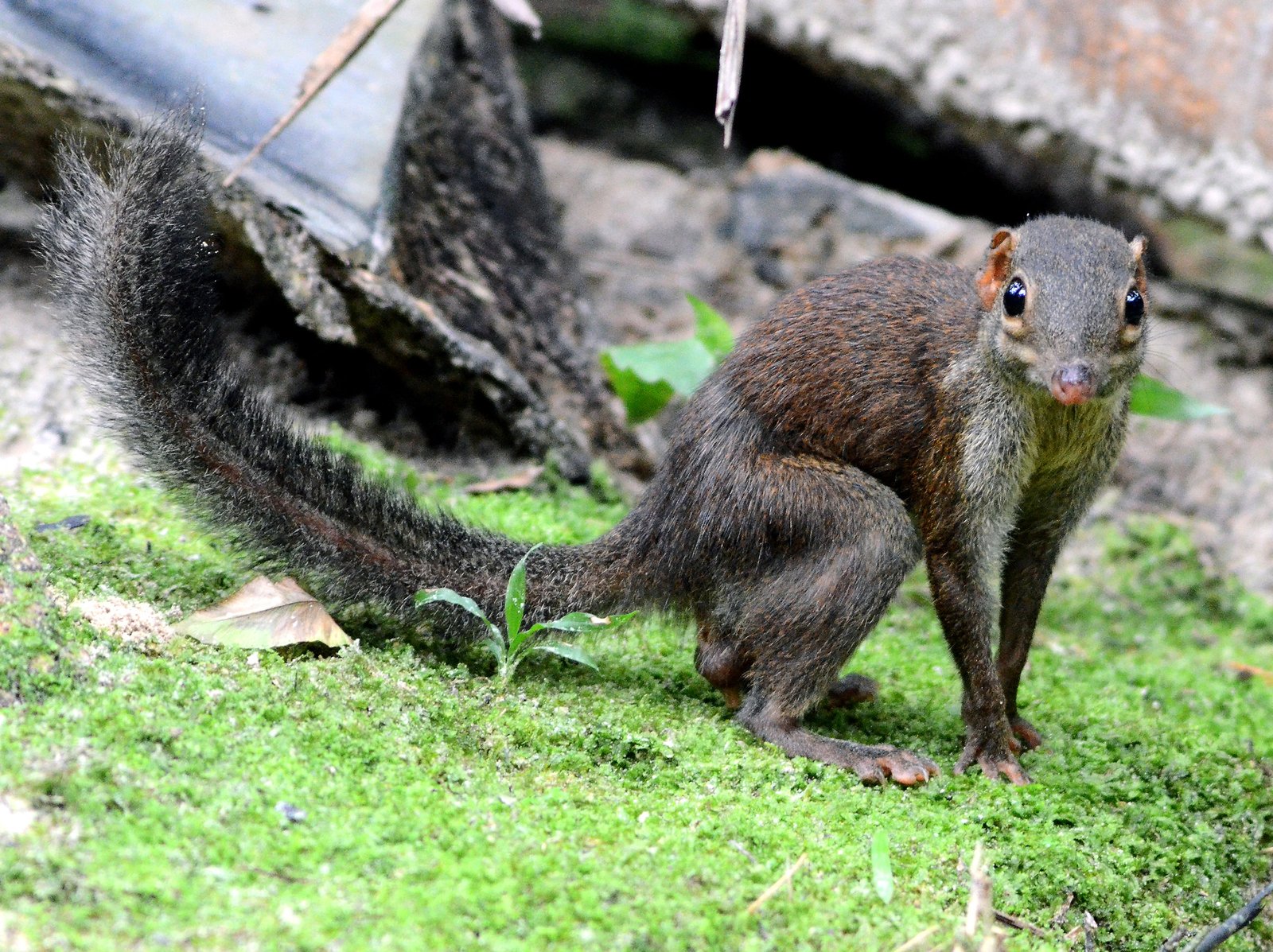 The key difference between the Common Tree Shrew and the Plantain Squirrel is facial structure and tail bushiness: Common Treeshrews have a distinct, long, pointed snout, brown fur, and are often on the ground or lower trees, while Plantain Squirrels have a rounder face, a much bushier tail, distinctive black/white/orange stripes, and are more arboreal, but both are common in forest, secondary growth and sub-urban habitat of Southeast Asia including West Malaysia.